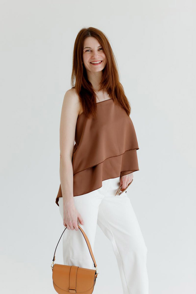 Елегантний атласний топ коричневого кольору з воланами. Розмір one size (регулюється за допомогою бретелей-зав'язок). Топ стане чудовою базою для створення модних образів. Однотонний дизайн робить топ універсальним, легко поєднується з різним одягом та аксесуарами. Матеріал з поліестеру гладкий і ніжний, легкий, практичний, довговічний в експлуатації.