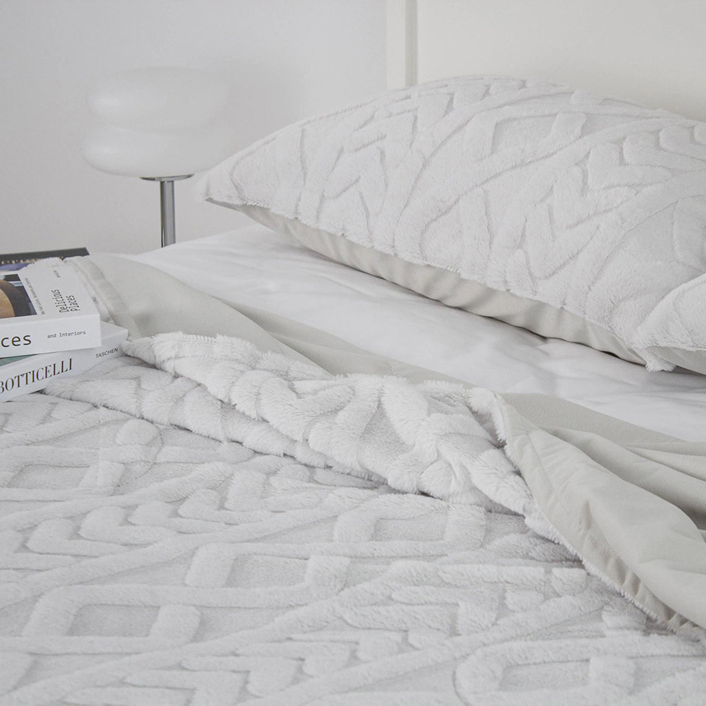 Розкішне покривало Soft Hug Angora світло-сірого кольору. Верх виконаний з преміальної тканини Angora Jacquard з красивим рельєфним візерунком, а низ - з м'якого велюру. Завдяки високій якості матеріалів, покривало відмінно тримає форму, залишається м'яким навіть після багаторазового прання.
