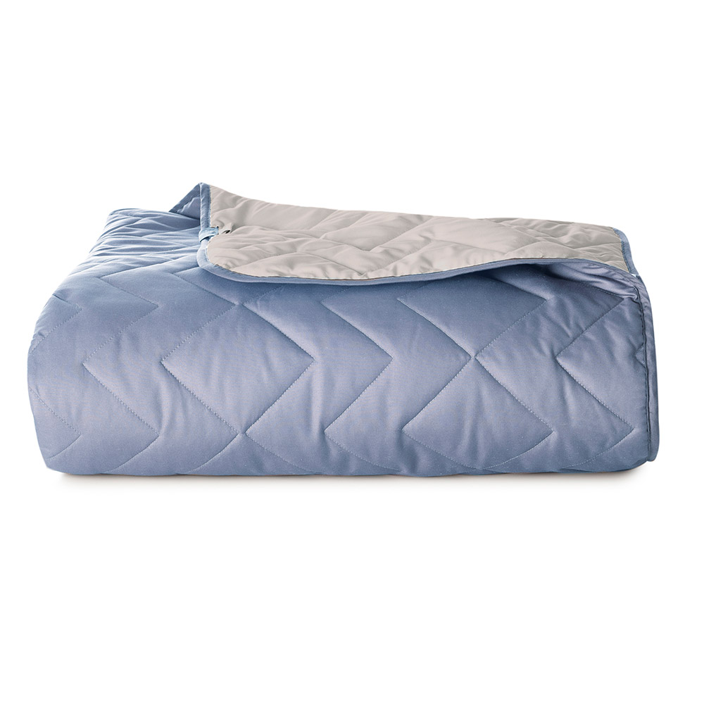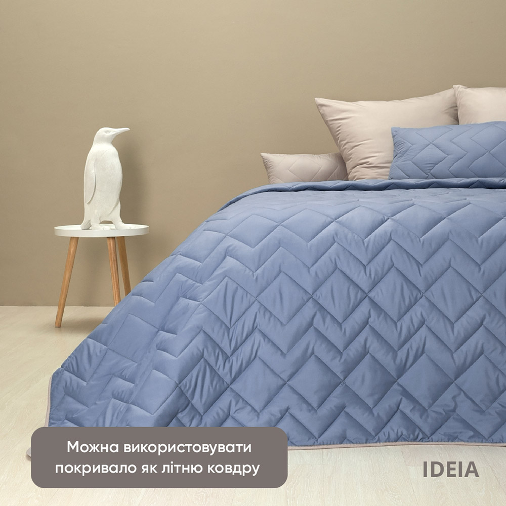Стильне стьобане покривало в лаконічному двоколірному дизайні. Покривало двостороннє, одна сторона кольору джинс, інша — світло-сіра. Це дозволяє вносити зміни в інтер'єр. Покривало пошите з м'якої якісної мікрофібри. Наповнювач із силіконізованого волокна не викликає алергії, практичний в експлуатації, зносостійкий, не збивається. Стьобане покривало можна також використовувати як літню ковдру. Виріб можна прати в машинці (покривало швидко сохне і не вимагає прасування).