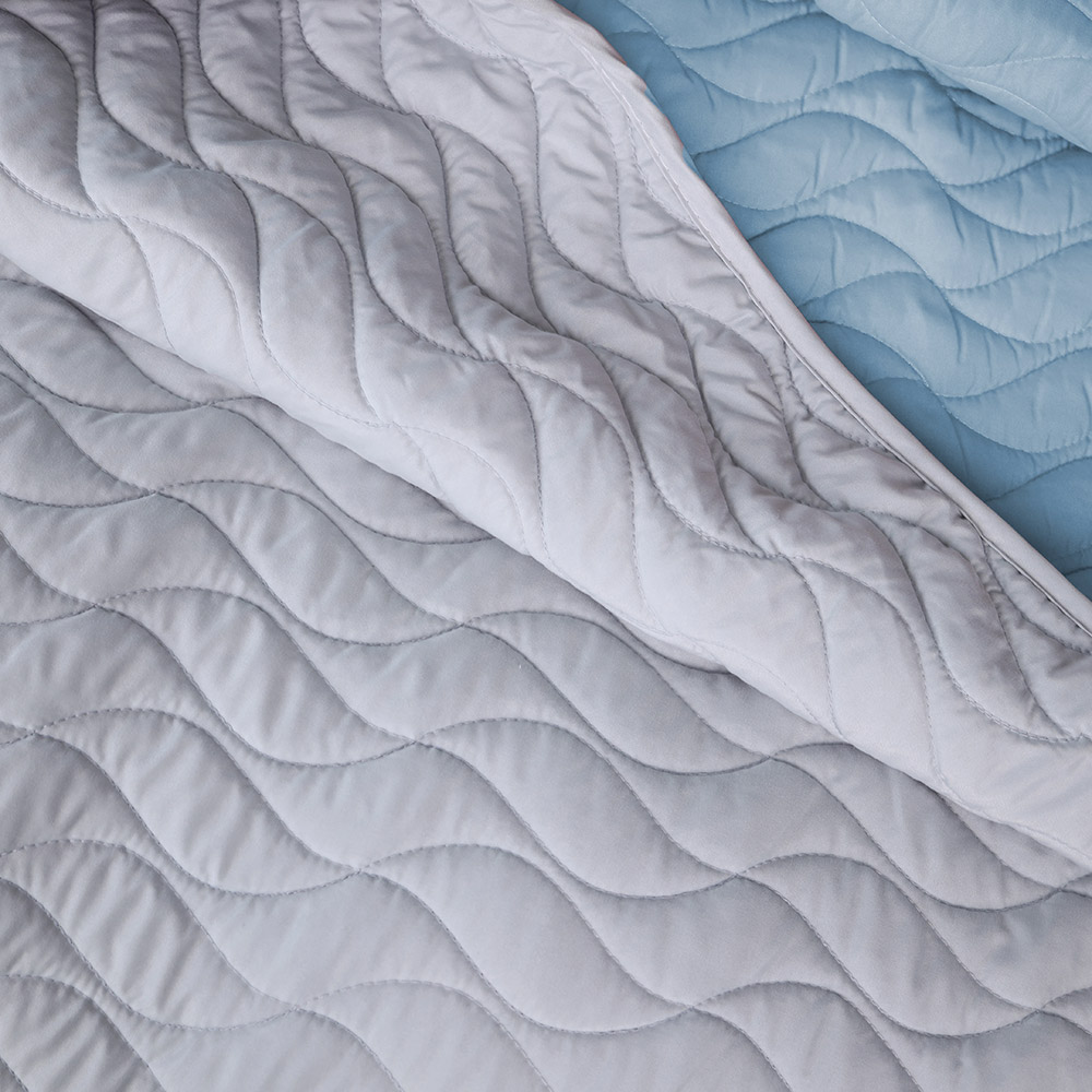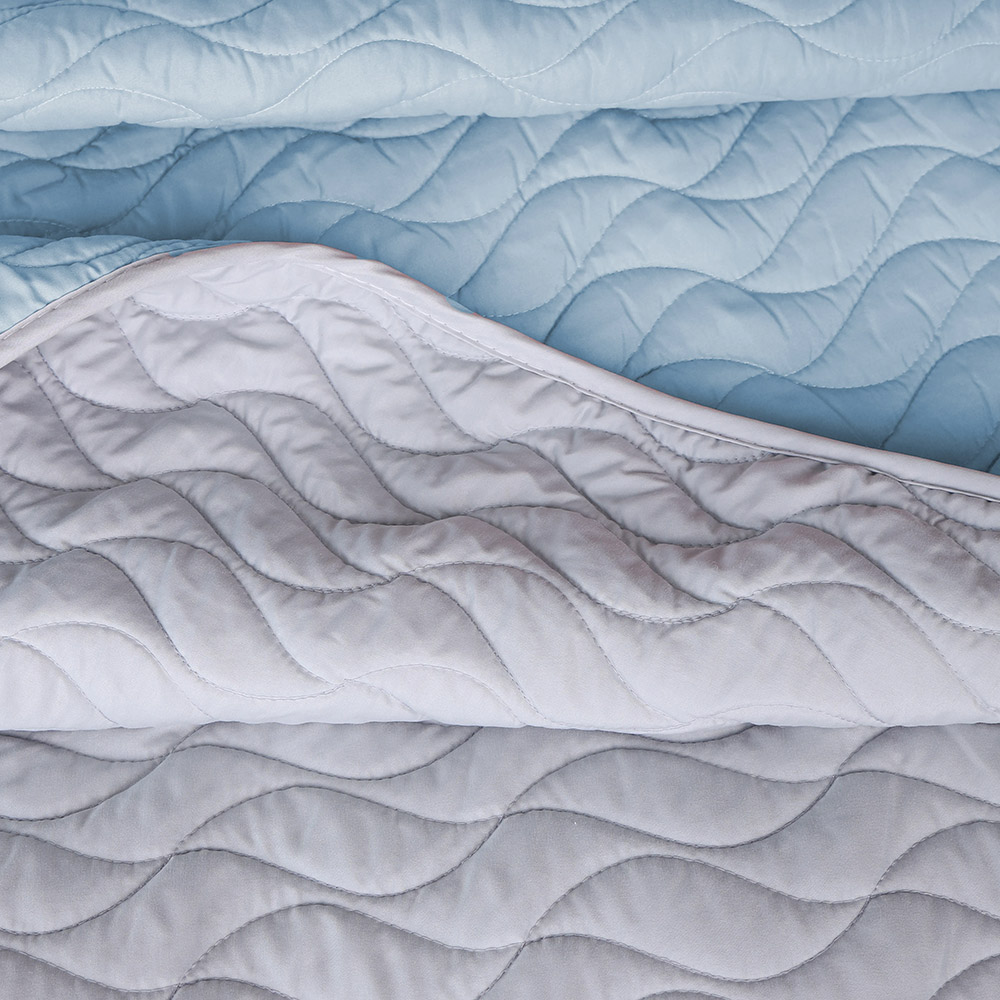 Одна сторона покривала виконана в сірому кольорі, інша - в блакитному, що дає змогу легко змінювати інтер'єр залежно від настрою. Фігурне стьобання надає виробу декоративного вигляду і забезпечує рівномірний розподіл наповнювача. Покривало поєднує в собі стиль, комфорт і функціональність.