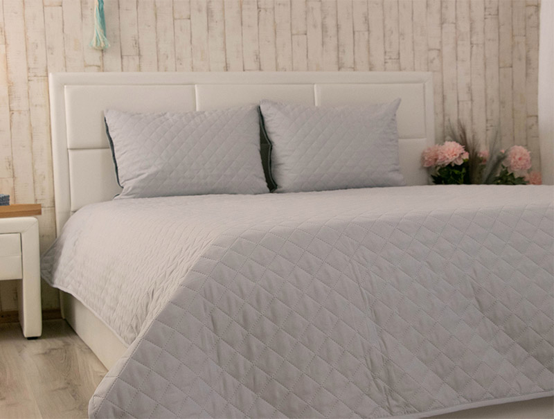 Стильне двостороннє покривало темно-сірого кольору зі стібкою ромбами. Покривало стане красивим акцентом у кімнаті, чудово доповнить сучасний інтер'єр. Покривало двостороннє, виконано з двох видів тканини: з одного боку велюр, а з іншого - мікрофібра. В якості наповнювача використовується силіконізоване поліефірне антиалергенне волокно.