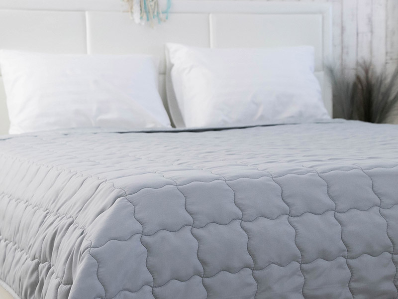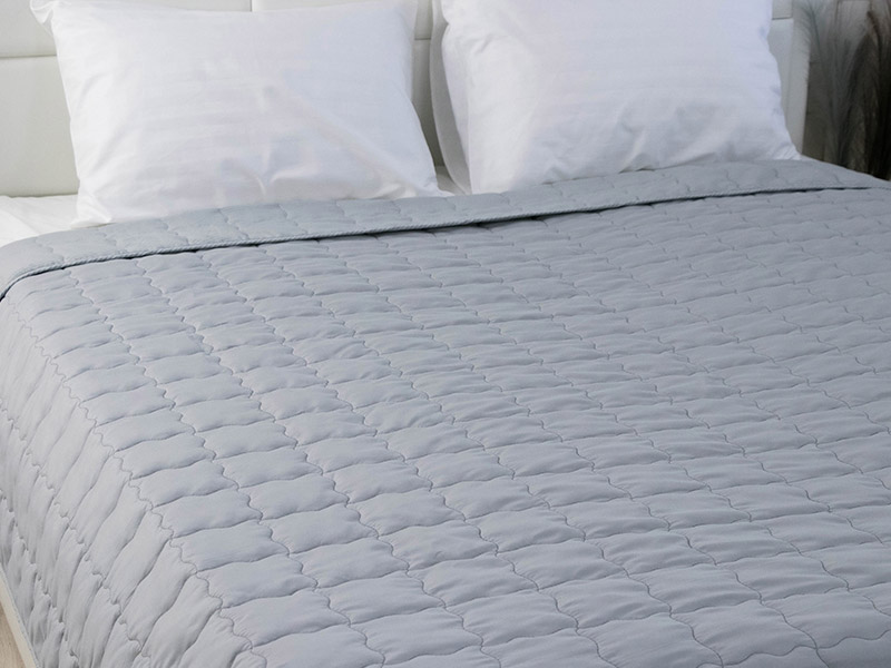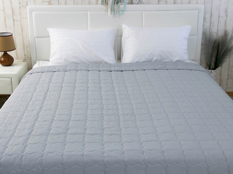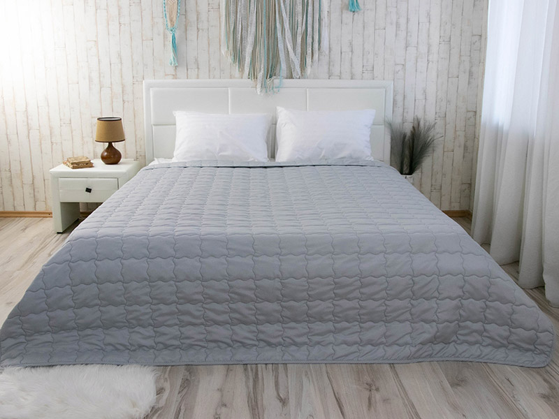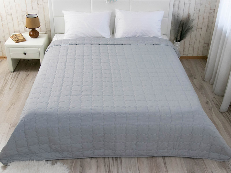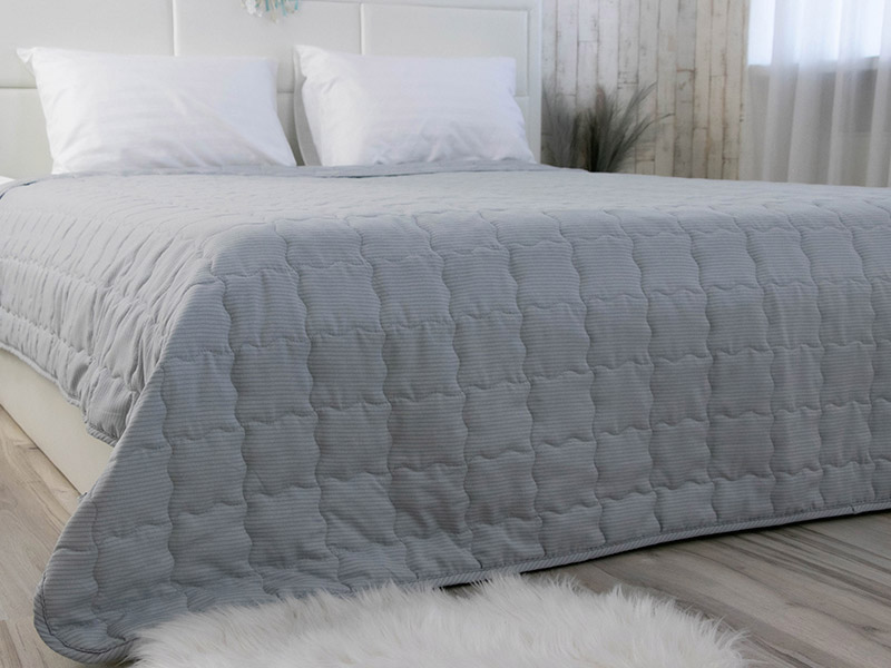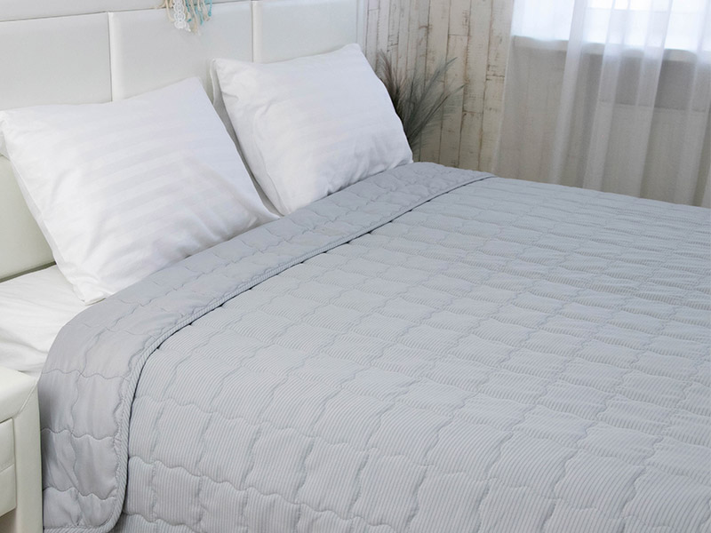 Двостороннє декоративне покривало з якісної м'якої мікрофібри сірого кольору (одна сторона зі смужками, інша сторона однотонна). Покривало стане стильним акцентом у кімнаті, чудово доповнить сучасний інтер'єр. Тканина приємна на дотик, практична і довговічна в експлуатації. Наповнювач із силіконізованого волокна робить виріб легким і довговічним.