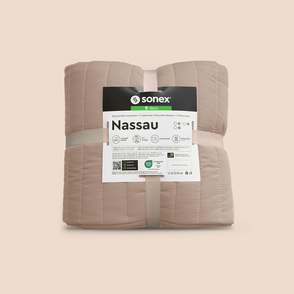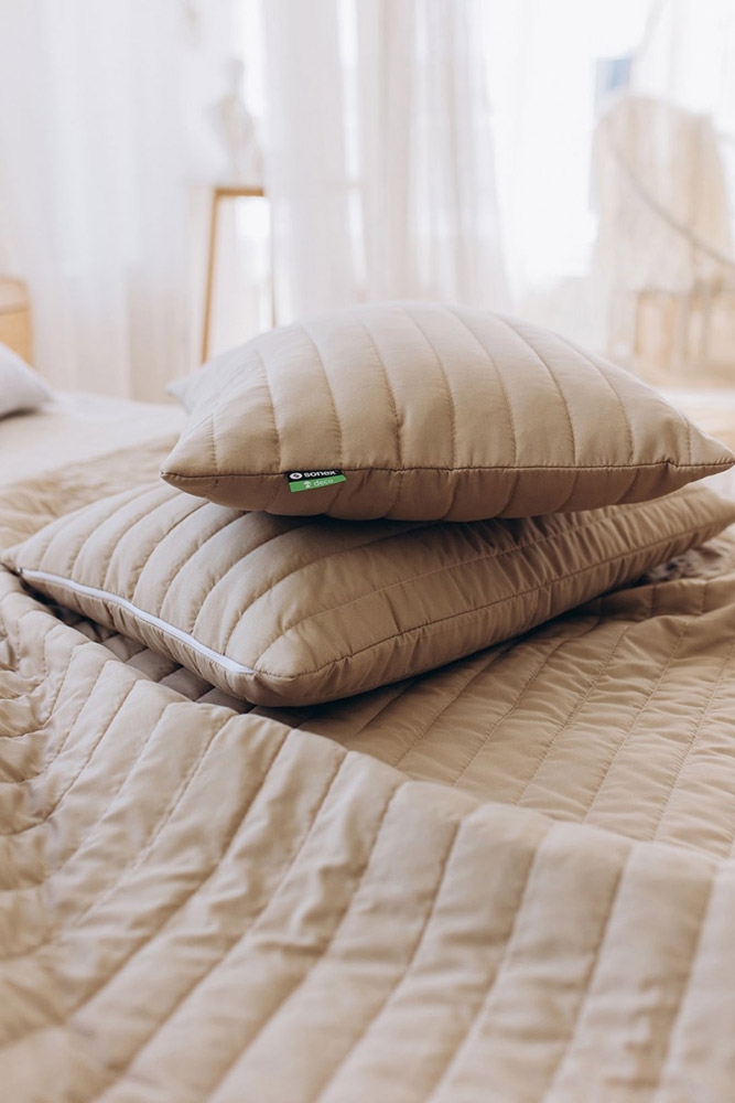 Стильний і практичний набір складається з покривала і двох наволочок в елегантному коричневому кольорі. Вироби однотонні, виконані з м'якої мікрофібри і простьобані в акуратну смужку, що надає їм сучасного і доглянутого вигляду. Наповнювач - легке поліефірне волокно, яке дарує комфорт і добре тримає форму.