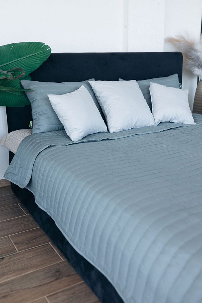 Стильний і практичний набір складається з покривала і двох наволочок у стильному сірому кольорі. Вироби однотонні, виконані з м'якої мікрофібри і простьобані в акуратну смужку, що надає їм сучасного і доглянутого вигляду. Наповнювач - легке поліефірне волокно, яке дарує комфорт і добре тримає форму.