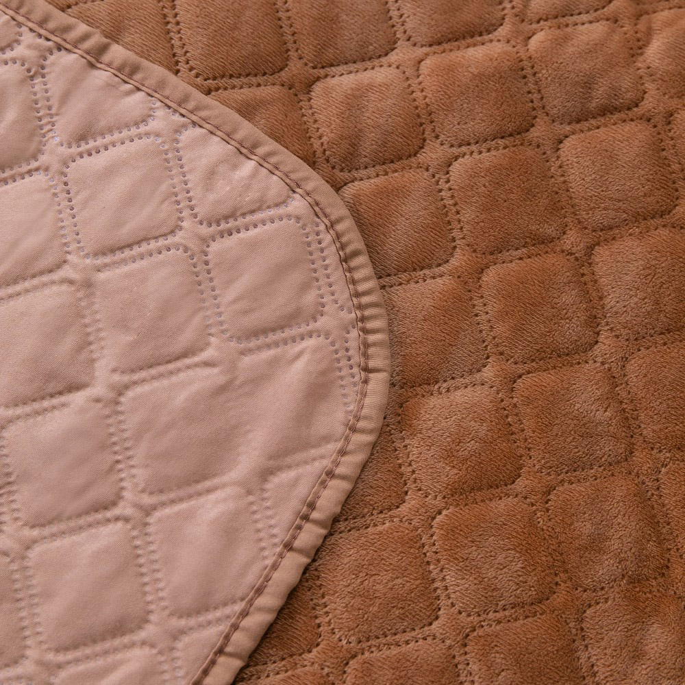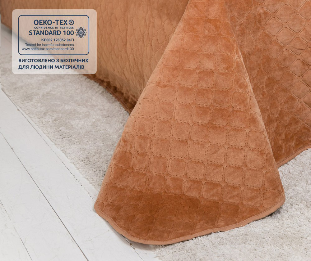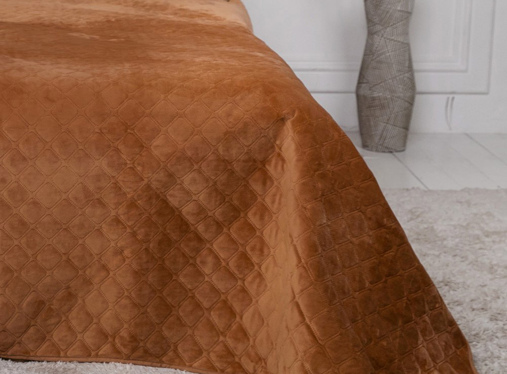 Однотонне велюрове покривало кавового кольору чудово доповнить інтер'єр, стане стильним та ефектним акцентом у кімнаті. Покривало виконане з м'якого якісного велюру, простегане фігурними ромбами. Завдяки технології ультразвукового паяння, наповнювач із поліефірного волокна не збивається, надійно зафіксований усередині покривала.