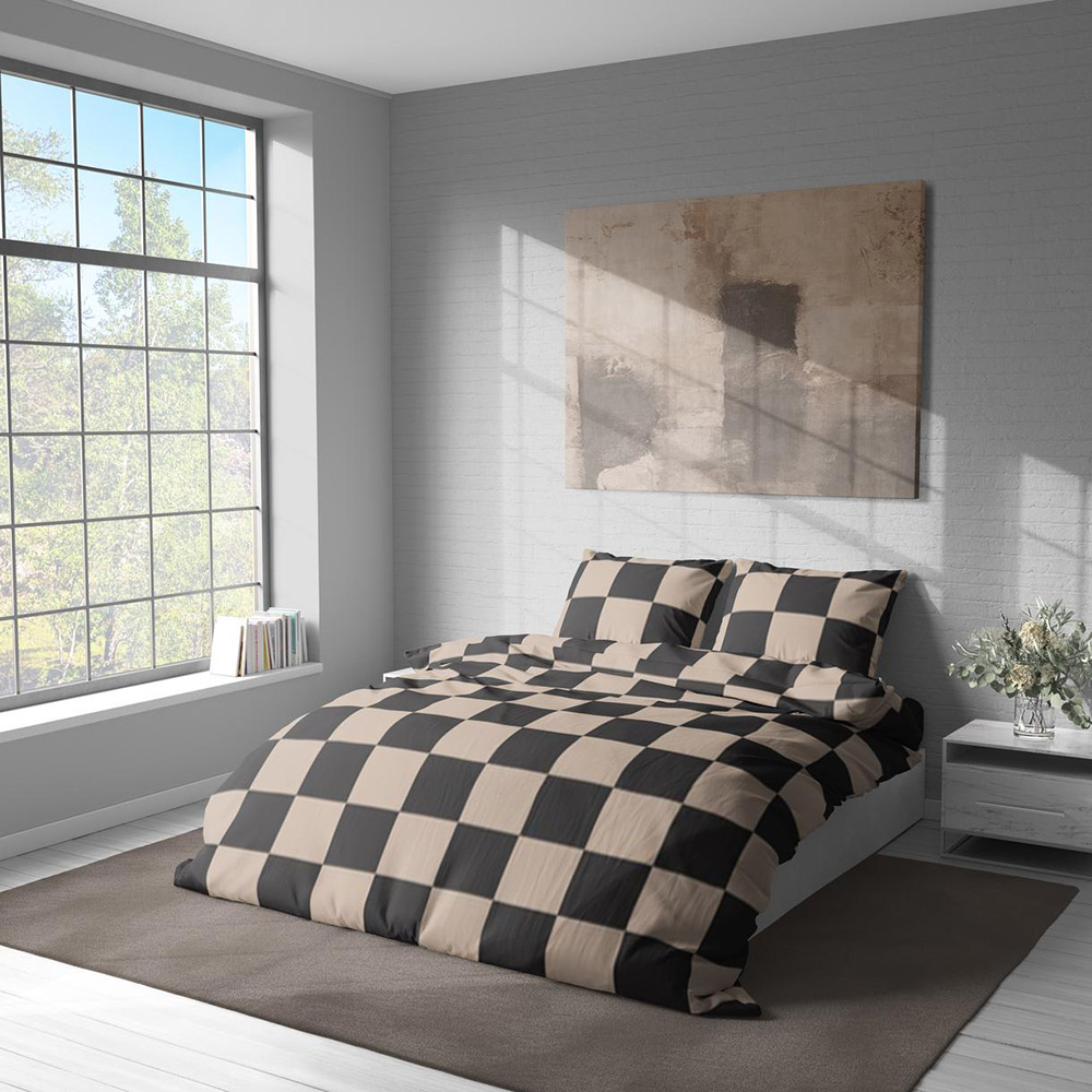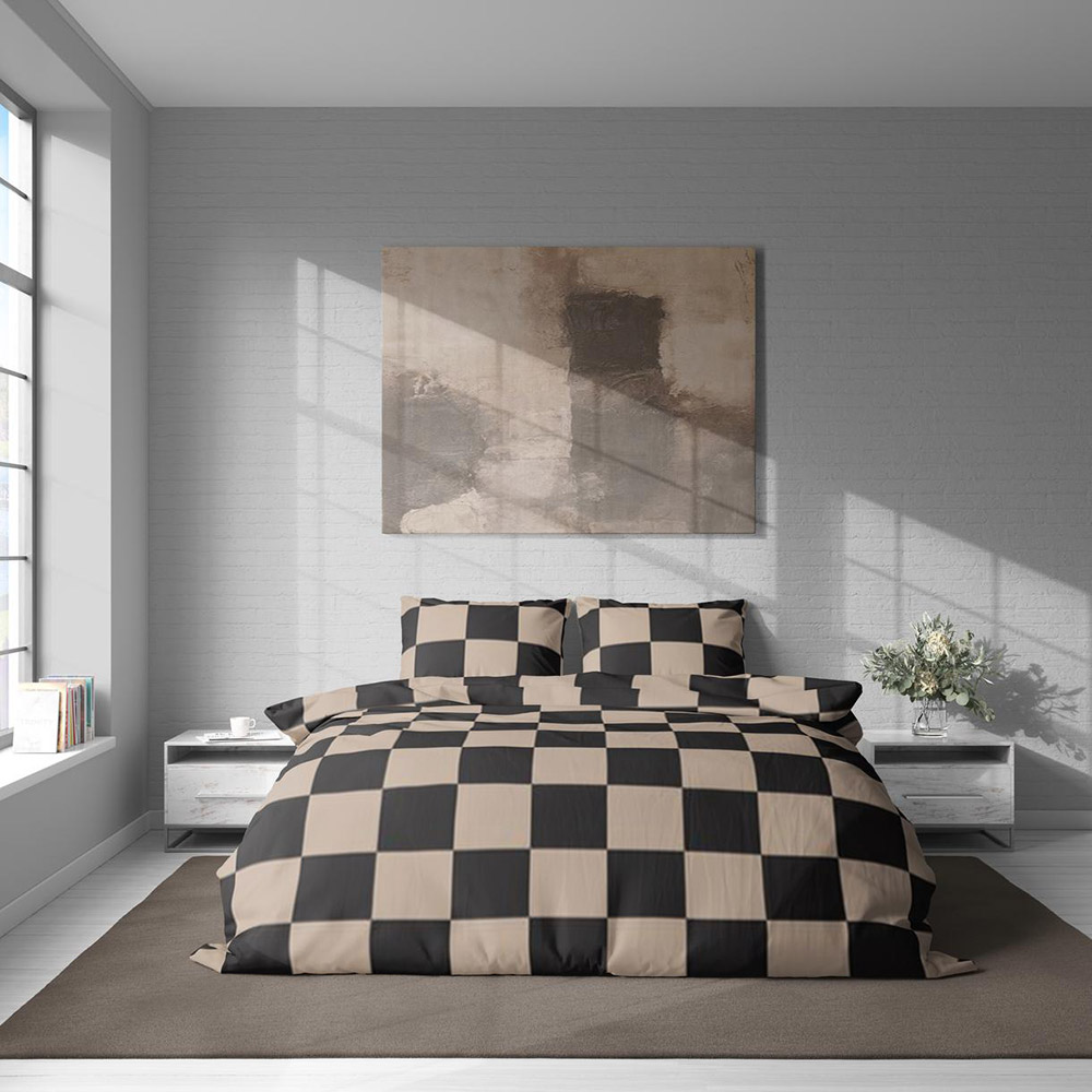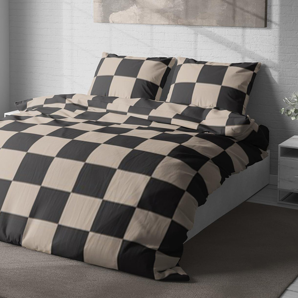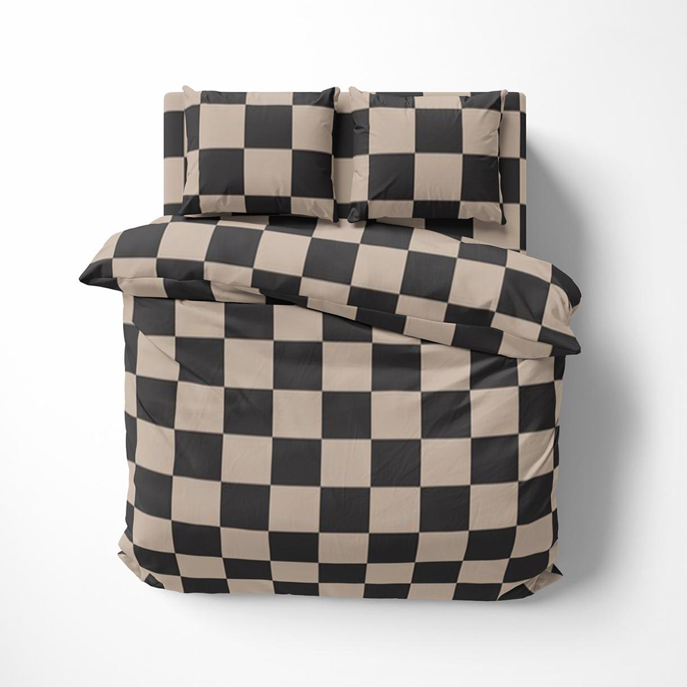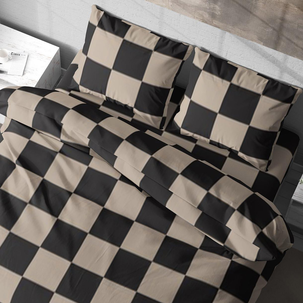 Постільна білизна в бежево-чорному кольорі з принтом у квадратики. Комплект стане стильним акцентом у спальні, відмінно впишеться в сучасний інтер'єр.