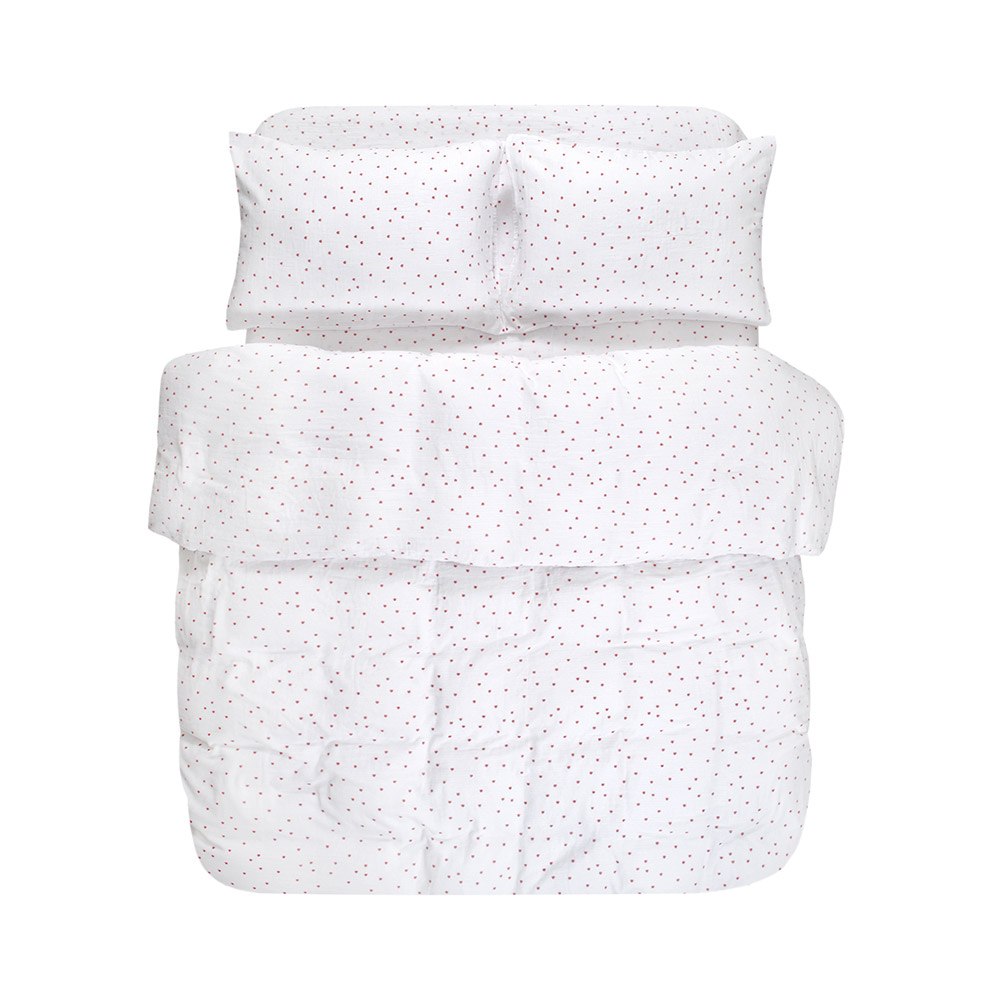 Постільна білизна зі 100% муслінової бавовни - ніжний дотик турботи і затишку. Білосніжний фон із червоними сердечками створює атмосферу легкості та романтики. Двошарова муслінова тканина м'яка, дихаюча і неймовірно приємна до тіла, водночас вирізняється міцністю і довговічністю - зберігає форму навіть після безлічі прань. Комплект упакований у стильний фірмовий чохол з мусліну - практично і красиво.
