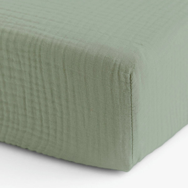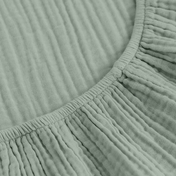 Однотонне простирадло сіро-зеленого кольору. Простирадло виконано з тканини муслін-преміум. Матеріал зі 100% органічної гіпоалергенної бавовни, легкий і приємний на дотик, з рельєфною фактурою, забезпечує комфортний сон і відпочинок.