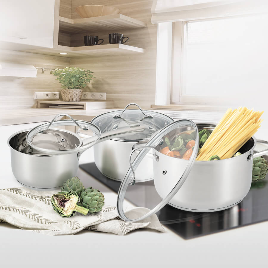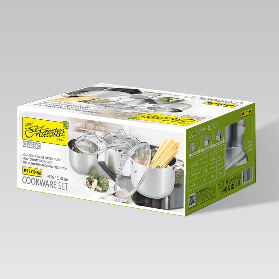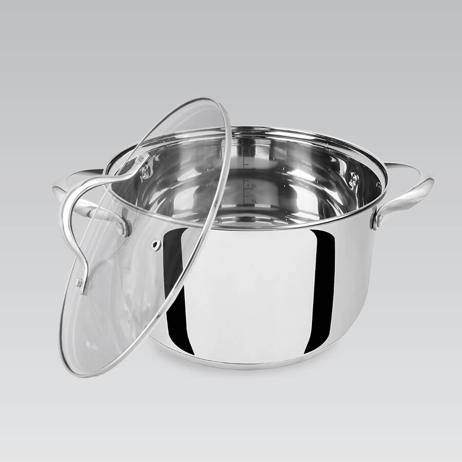 Набір посуду 6 предметів Maestro MR3519-6M. У набір входять каструлі трьох найпопулярніших обсягів на 1,8; 2,5 та 3,4 літри зі скляними кришками з отворами для зливу води. Продумано багатошарове термоакумулююче дно у посуді, зручні металеві ручки, шкала об'єму рідини. Кришка з термостійкого скла з отворами для випуску пари. Підходить для всіх типів плит та варильних поверхонь. Можна мити в посудомийній машині