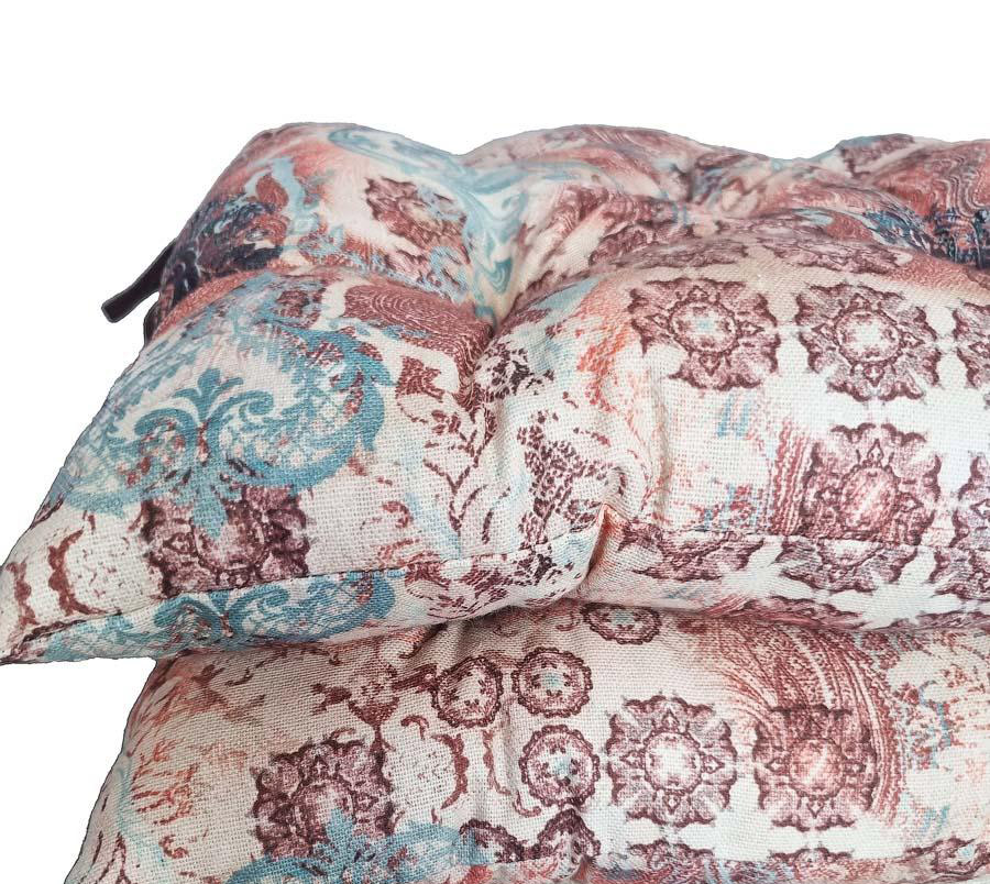 Квадратна подушка з вишуканими візерунками має гарний та елегантний вигляд. Подушка чудово доповнить інтер'єр, а також зробить сидіння стільця більш м'яким і комфортним. Подушку виготовлено з якісної та практичної іспанської тканини на основі бавовни та поліестеру, з наповнювачем із холофайбера. Виріб кріпиться до стільця за допомогою двох зав'язок.