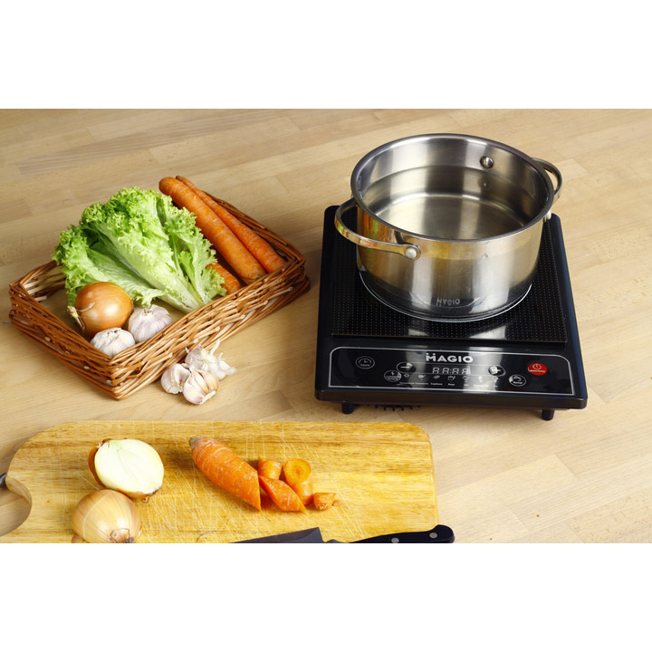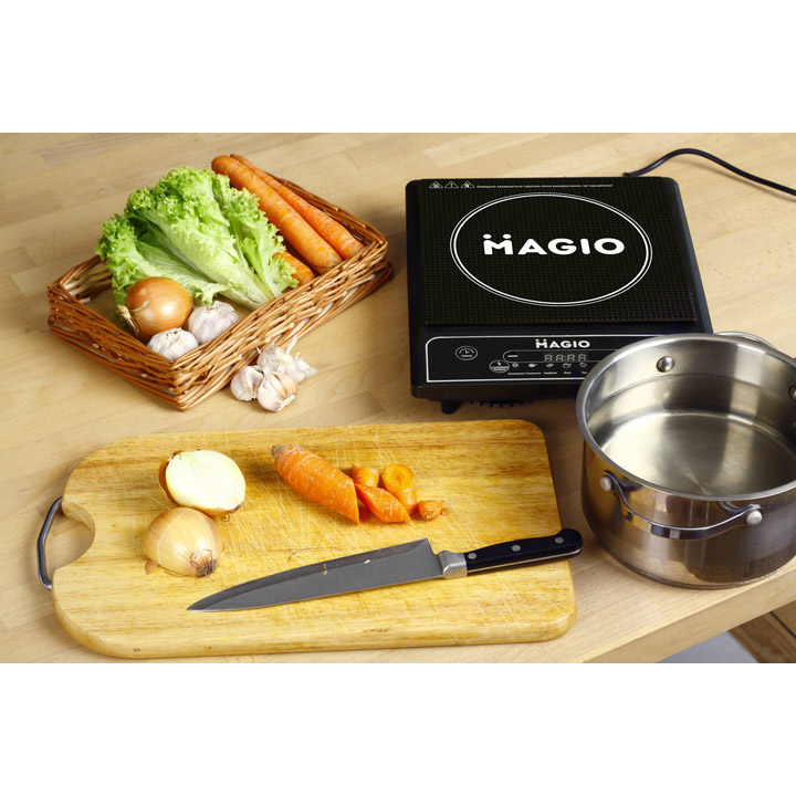 Електрична індукційна плита від Magio - компактне і стильне рішення для кухні з однією конфоркою. Чорна скляна поверхня легко очищається і надає кухні сучасного вигляду. Плита оснащена функцією автовимкнення та розпізнавання посуду, запобігаючи ввімкненню без нього. Доступні регулювання температури та потужності для зручного приготування страв.