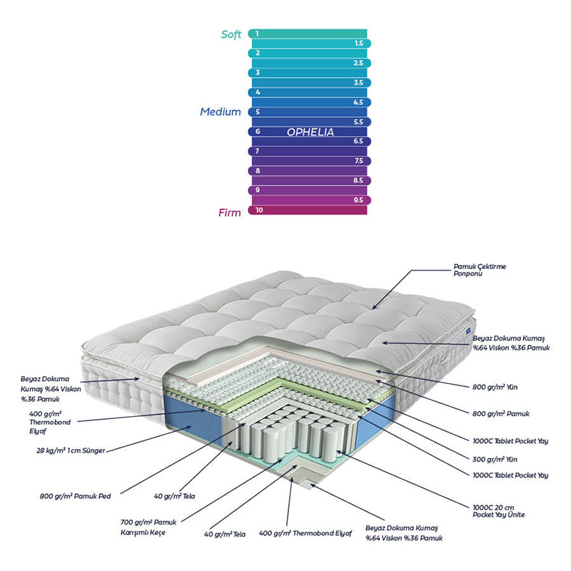 Елітний матрац ручної роботи Ophelia. Модель з топпером і подвійним пружинним блоком, забезпечить неперевершений комфорт і повноцінний сон. Завдяки подвійному пружинному блоку матрац має підвищені ортопедичні властивості, правильно розподіляє навантаження, підтримує хребет у правильному анатомічному положенні. Чохол матраца виконаний з натуральної бавовни, м'який і приємний на дотик. Натуральні вовна і бавовна в складі виробу мають гігроскопічні властивості, що допомагає швидко випаровувати зайву вологу і вентилювати повітря.