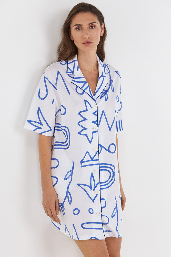 Нічна сорочка білого кольору з абстрактним синім принтом, виконана з м'якого і приємного до тіла бавовняного матеріалу, що забезпечує комфорт і свободу рухів. Модель з короткими рукавами, відкладним коміром, бічними кишеньками, спереду застібається на ґудзики. Сучасний крій і стильний дизайн роблять сорочку ідеальним вибором для затишного сну і домашнього відпочинку.