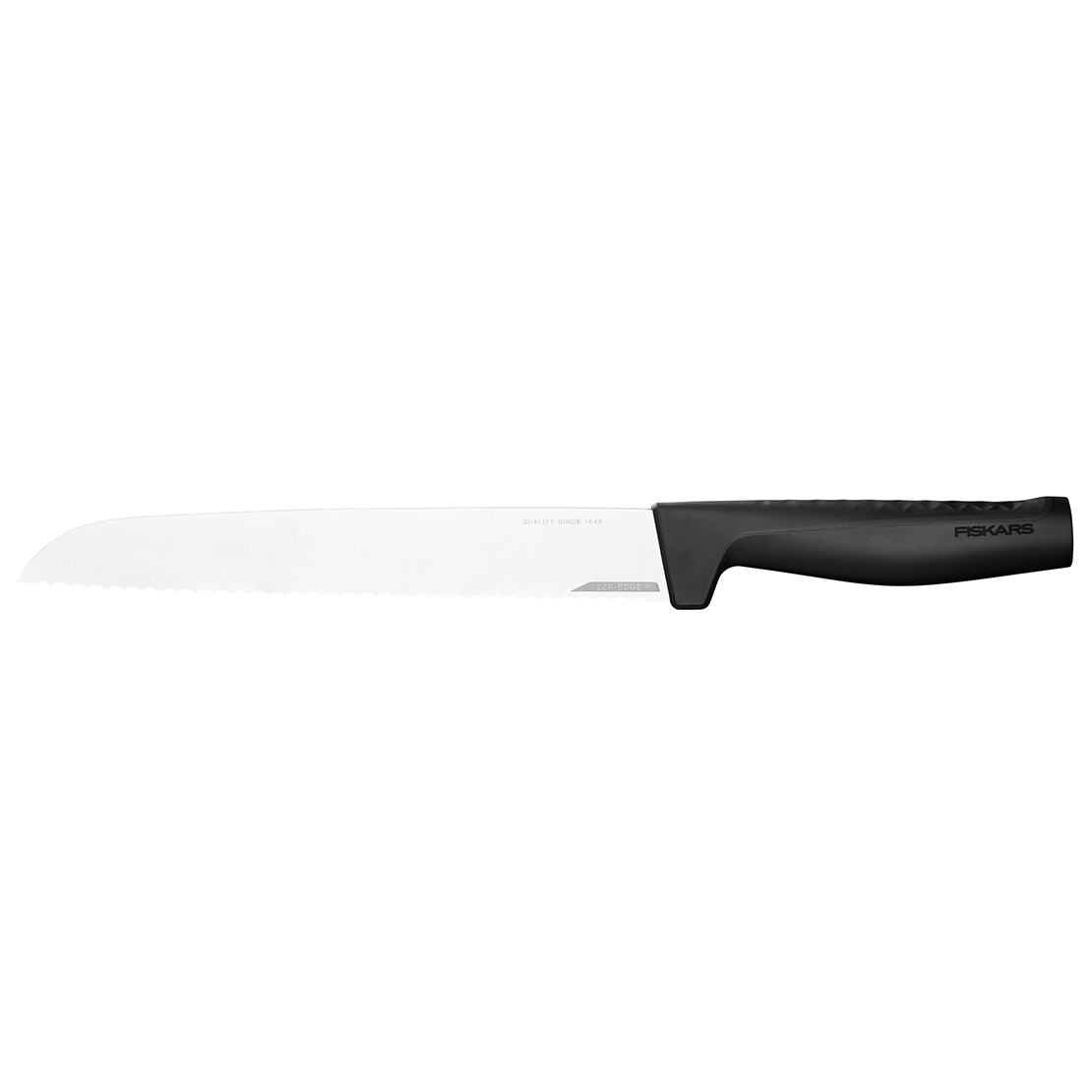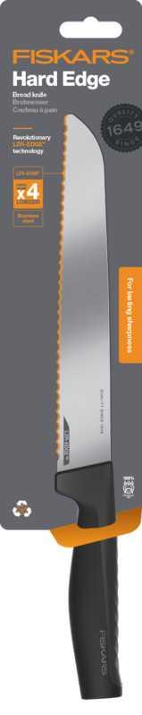 Ніж для хліба 22 см Hard Edge Fiskars 1054945. Має довге зубчасте лезо, тому він ідеально підходить для різання навіть хліба з твердою кіркою. Ніж оснащений товстим лезом з нержавіючої сталі, розробленим з використанням інноваційної технології, яка зберігає ніж в чотири рази довше, ніж традиційні ножі. Ергономічна ручка з тривимірною текстурою для зручного захоплення. Можна прати в пральній машині.