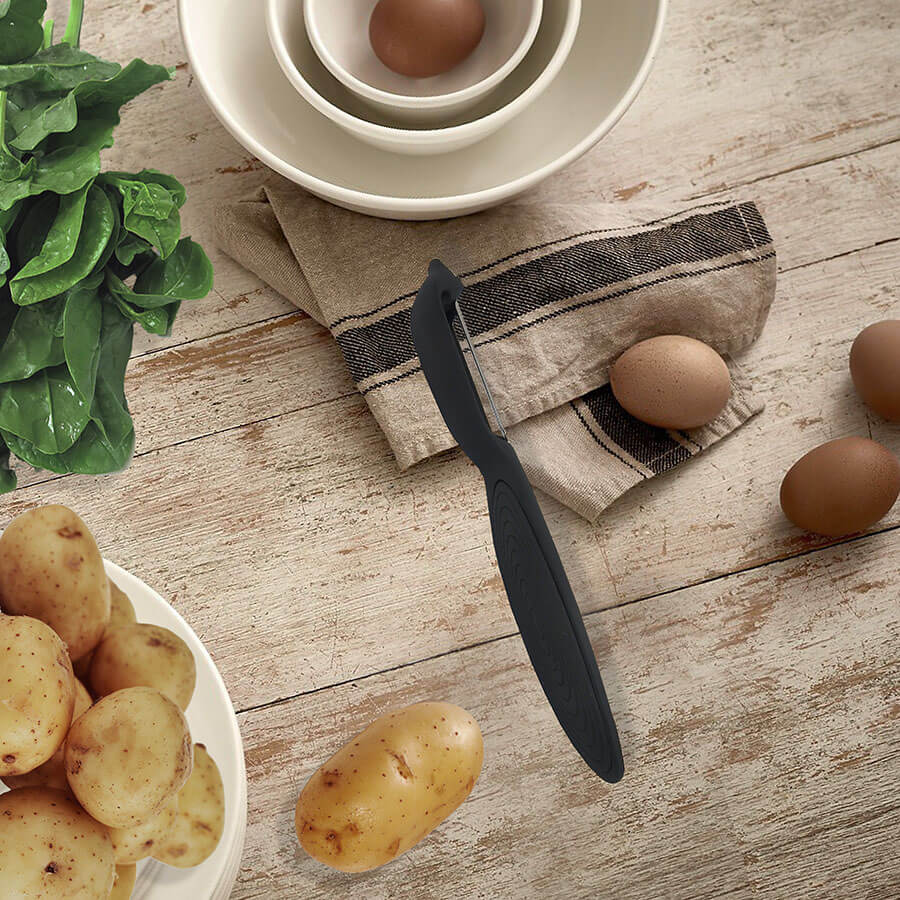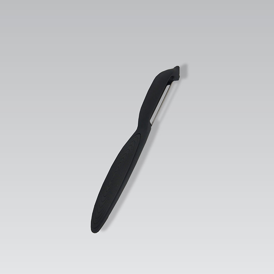 Овочечистка Maestro MR1557. Пряма овочечистка чорного кольору призначена зрізання тонкого шару шкірки з овочів та фруктів. Ніж-овочечистка має безпечну конструкцію, що захищає руки від випадкових порізів, має привабливий зовнішній вигляд і довгий термін служби. Лезо виконане з високоякісної нержавіючої сталі.