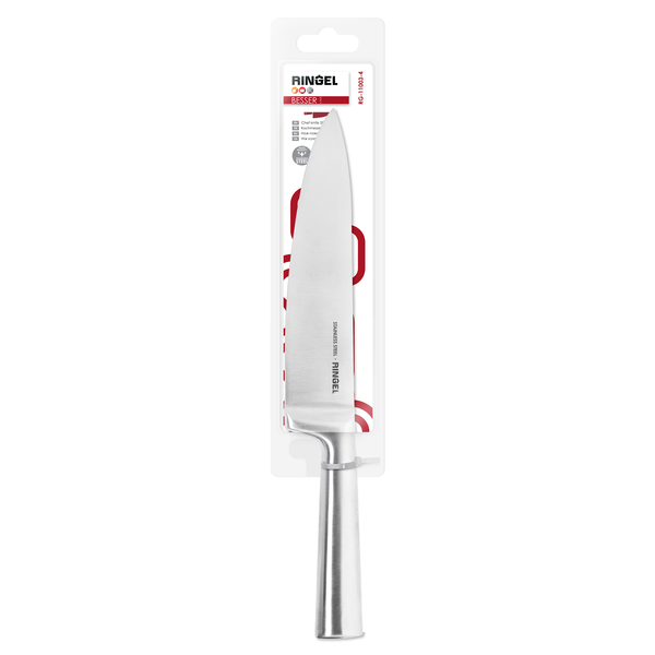 RINGEL - залізний характер, блискучий смак! Корпус серії ножів BESSER виготовлений методом суцільного лиття з нержавіючої сталі. Ножі мають правильну геометричну форму і добре збалансовані. Сатинове полірування ручки надає завершеного вигляду ножам і додає антиковзаючого ефекту для безпечного використання ножів. Мартенситна нержавіюча сталь (сталь AISI 420), з якої виготовлено лезо ножа, має високу міцність і корозійну стійкість. Підвищений вміст вуглецю надає оптимальну твердість 47-50 за шкалою Роквелла.