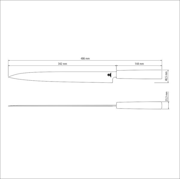Ніж для суші 330 мм. Незамінний для приготування суші та сашими. Ніж має лезо з високоякісної нержавіючої сталі та спеціальну кромку для точних розрізів. Нейлонова ручка має антимікробний захист, що перешкоджає та зменшує ріст бактерій та грибків. Ця технологія застосовується в процесі виготовлення ручки та діє протягом усього терміну служби продукту, але не виключає необхідності мити ніж після використання.