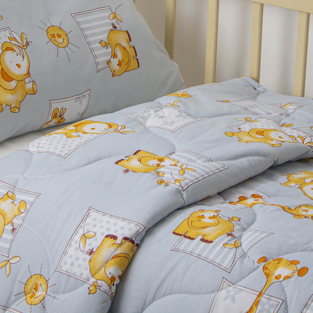 Ніжна і затишна дитяча ковдра стане чудовим вибором для комфортного сну малюка в будь-яку пору року. Верх виконаний з 100% бавовни - натуральної, м'якої і дихаючої тканини, що ідеально підходить для чутливої дитячої шкіри. Тканина сірого кольору із симпатичним дитячим принтом із тваринами. Як наповнювач використовується сучасне поліефірне волокно Double Air, яке забезпечує чудову терморегуляцію і зберігає об'єм, залишаючись водночас повністю гіпоалергенним. Ковдра створює комфортний мікроклімат, добре пропускає повітря, утримує тепло і не перегріває дитину.