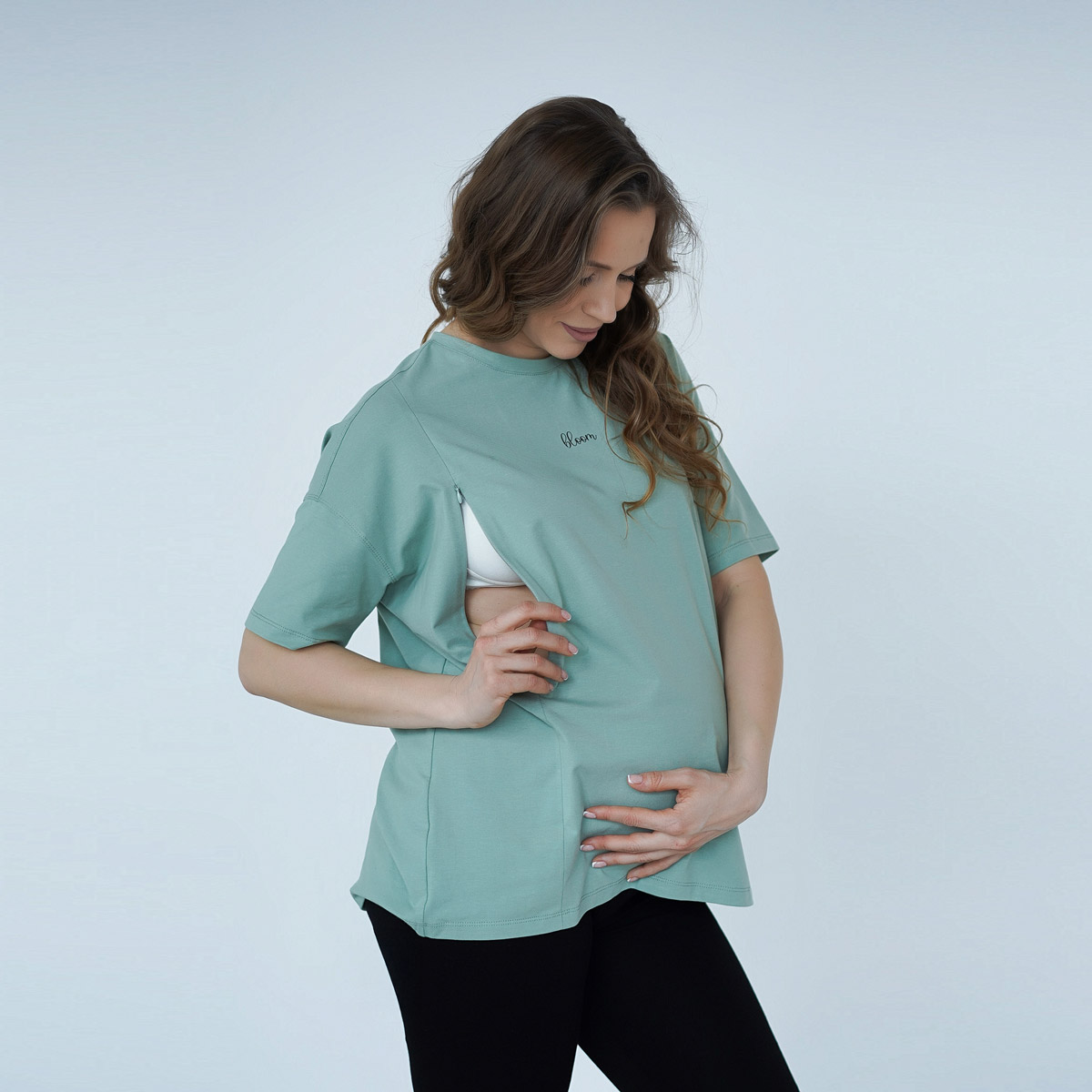 Футболка для годування ментолова - зручна і універсальна модель для майбутніх мам. Вільний крій підходить на будь-якому терміні, а приховані блискавки полегшують процес годування. Стильний ментоловий відтінок освіжає образ.