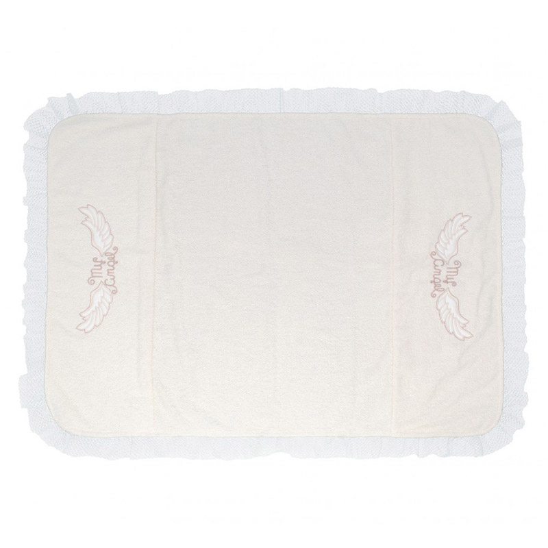 Махрова крижма ніжного молочного кольору, розміром 70х100 см, з мереживними краями. З боків - тематична вишивка-аплікація у вигляді крил і напису My Angel. Зворотний бік - з бавовняною підкладкою.