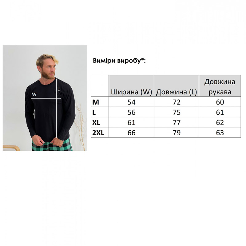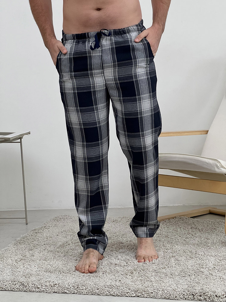 Чоловічий піжамний комплект складається з лонгсліва і штанів. Штани вільного крою зі зручними кишенями, пояс - на гумці та кулісці. Штани виконані з м'якої і теплої фланелі в синьо-сірому кольорі з модним принтом у клітинку. Тканина з легким начосом на внутрішньому боці для додаткового комфорту й тепла. Лонгслів однотонний, темно-синього кольору, з довгими рукавами та круглою горловиною, виконаний з натуральної бавовняної тканини.