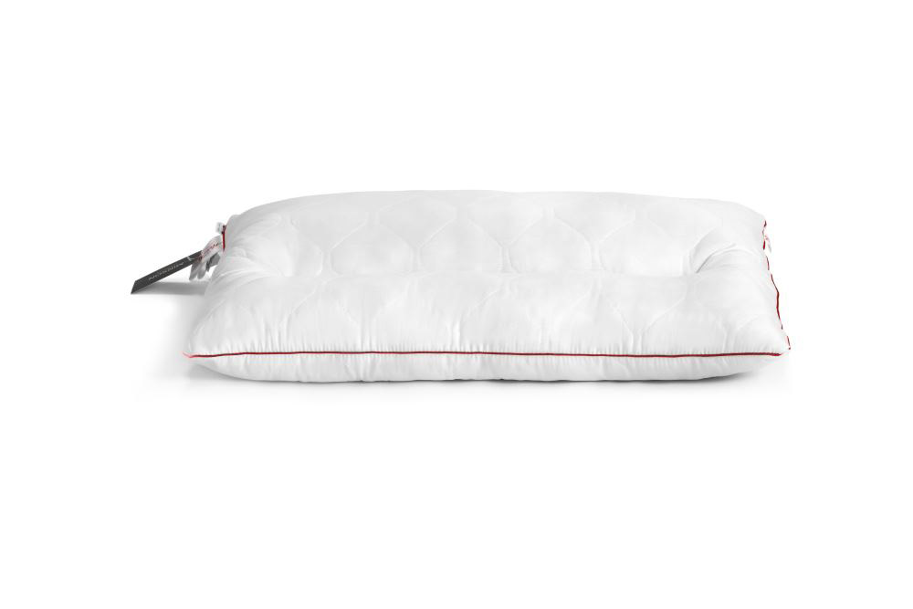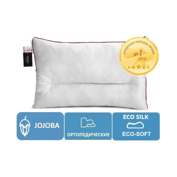 Ортопедична подушка дарує здоровий і комфортний сон, підтримує голову і шийний відділ хребта в правильному положенні. Великий валик з наповнювачем з EcoSoft - м'яким і ніжним волокном, яке відмінно пропускають повітря і добре зберігає форму. Менший валик зроблений з німецького наповнювача EcoSilk, який має властивості шовку, але є доступним і антиалергенним. У подушці є вбудована блискавка, завдяки якій можна відрегулювати кількість наповнювача. Чохол виконаний з італійського білого мікросатин з червоним кантом і просоченням маслом жожоба. Тканина на основі бавовни і поліефірного волокна, м'яка, приємна на дотик, практична, проста в догляді. Масло жожоба має зволожуючі, регенеруючі, протизапальними властивостями.