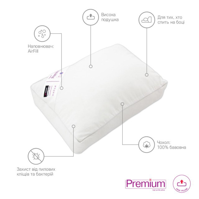 Цей варіант ідеально підійде для тих, хто вважає за краще спати на високих подушках. Подушка забезпечує надійну підтримку для шиї, створюючи затишок і комфорт під час сну. Таку подушку обов'язково оцінять ті, кому зручніше спати на боці. Подушка виробляється з натуральної та приємною на дотик бавовняної тканини, а в якості наповнювача використовується антиалергенне волокно у формі кульок.