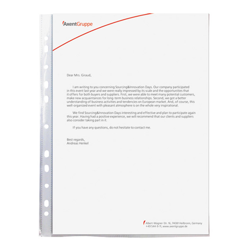 Файли захищають документи від навколишніх впливів і механічних пошкоджень. Завдяки наявності перфорації, документи у файлах можуть зберігатися в папках-реєстраторах, у папках на кільцях, у папках-швидкозшивачах. Це забезпечує систематизацію та зручність у роботі з документами. Файли Axent виготовлені з первинного пластику, який забезпечує максимальну прозорість файлу та ідеальну глянцеву поверхню. Корінець надійно спаяний з файлом - файл залишається цілісним і витримує тривалу експлуатацію. Щільність 40мкм - підходить для частого використання.