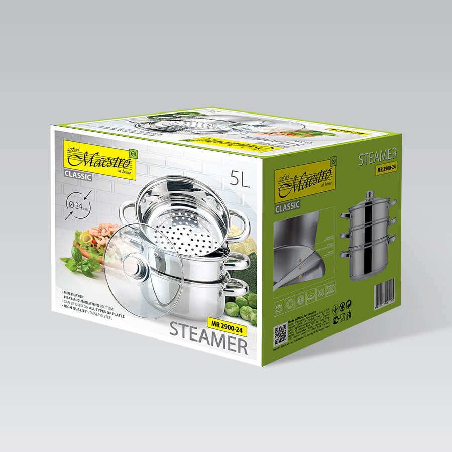 Пароварка 2,0 л MAESTRO MR 2900-18 - зручна і практична каструля для приготування страв на пару. Вона виконана з високоякісної нержавіючої сталі і має багатошарове термоаккумулирующее дно. Такий вид каструль підходить для всіх типів плит і нагрівальних елементів, так як швидко нагрівається і довго підтримує високу температуру.Пароварка має 2 знімних рівня, тому ви можете приготувати дві різні страви одночасно, а також використовувати нижню каструлю для приготування перших страв. Пароварку і її компоненти можна мити в посудомийній машині.