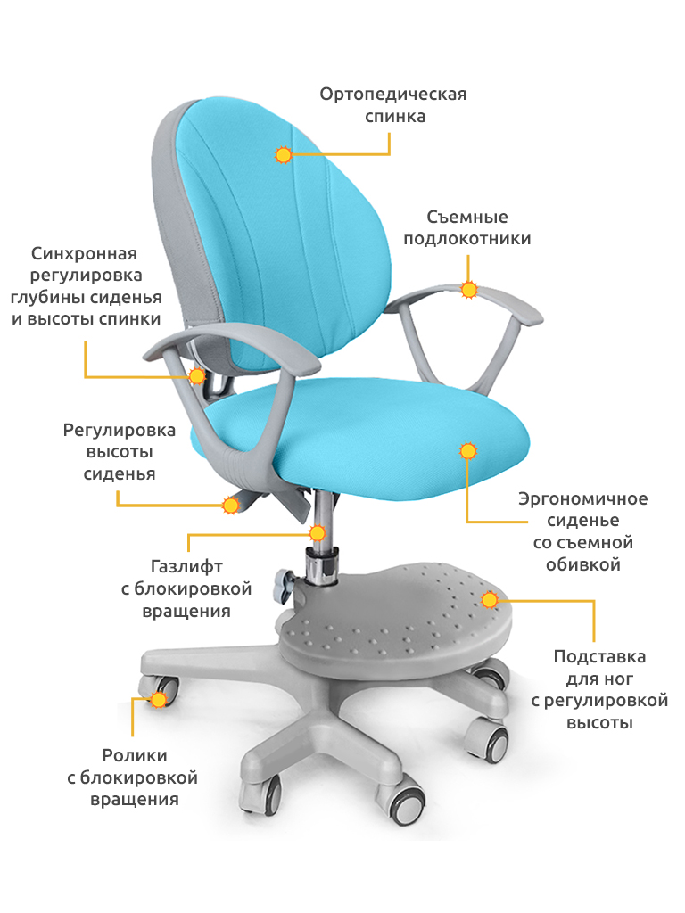 Підлокітники: можна зняти і так само легко знову закріпити на каркасі крісла. Ще одна з функціональних особливостей крісла -знімна підставка для ніг, яка регулюється по висоті. Тому крісло можна використовувати разом зі стандартним нерегульованим столом. Таким чином, можна максимально точно налаштувати крісло під зріст дитини. Під сидінням розташований гвинт для регулювання глибини крісла, тому можна з легкістю підлаштувати крісло під параметри дитини. Глибина крісла і висота спинки регулюються синхронно.