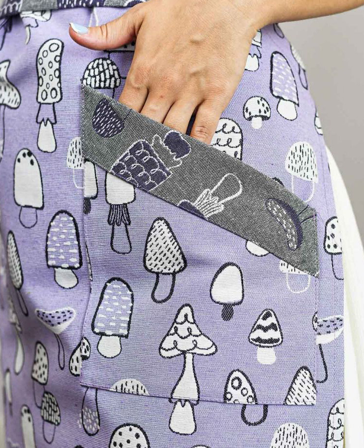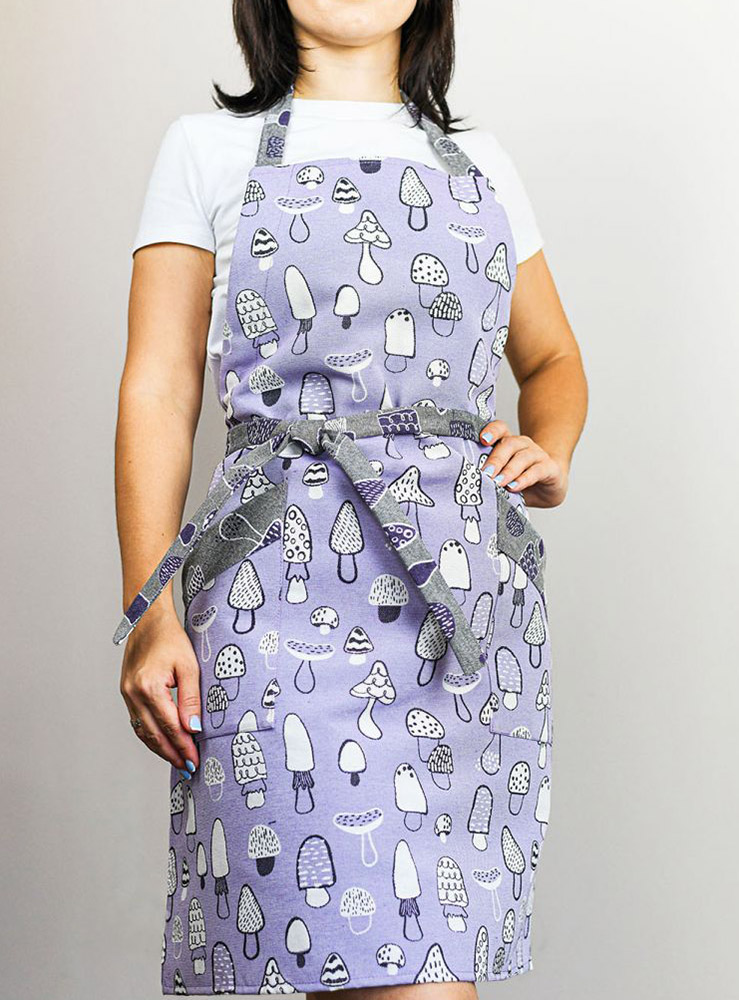 Фартух лілового кольору, виконаний з якісної практичної тканини на основі бавовни та поліестеру. Симпатичний принт із грибочками чудово доповнить кухонний інтер'єр. Фартух з кишенями та зав'язками. Виріб захистить одяг під час приготування їжі, стане незамінним на кожній кухні.