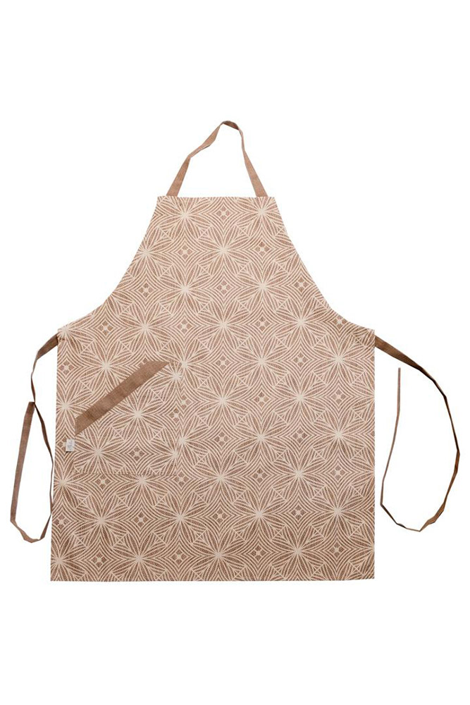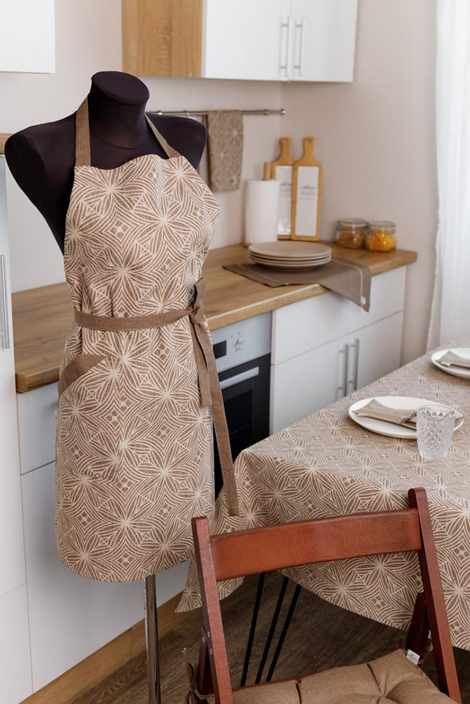 Кухонний фартух у бежево-коричневій гамі з красивим візерунком і зі зручною кишенею. Фартух з колекції "Кориця", стане незамінним на кухні, захистить ваш одяг під час процесу приготування їжі. Фартух виготовлений з натуральної бавовняної тканини. Матеріал приємний на дотик, практичний, не вимагає особливого догляду, міцний, надовго зберігає привабливий зовнішній вигляд. Розмір легко регулюється за допомогою зав'язок, дозволяючи підігнати фартух під будь-яку фігуру.