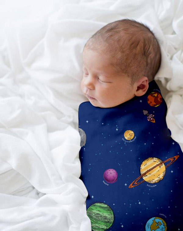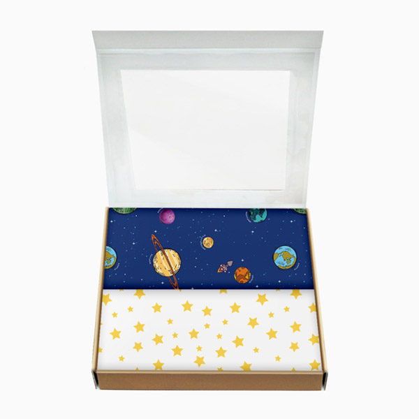 Набір складається з двох пелюшок. Одна пелюшка синього кольору з космічним малюнком, а інша – білого кольору з жовтими зірочками.