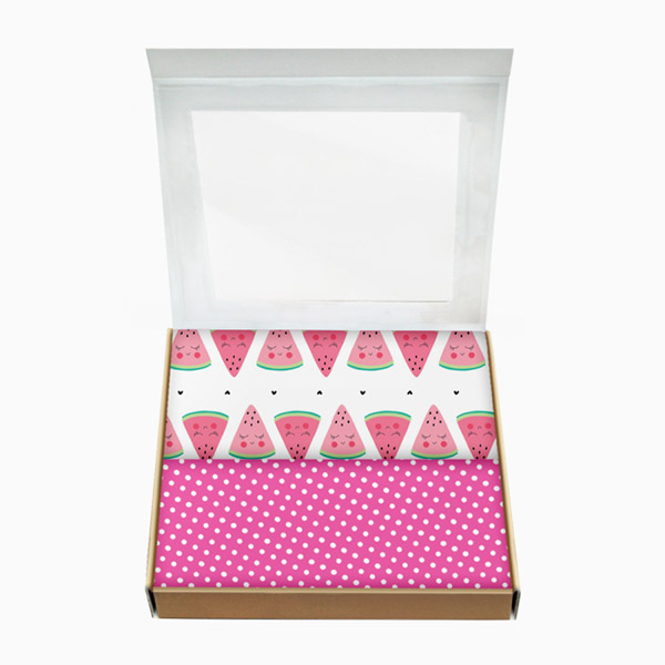 Набір складається з двох пелюшок. Одна пелюшка білого кольору з симпатичним малюнком з кавуновими дольками, а інша - кольору фуксії з принтом у горошок.