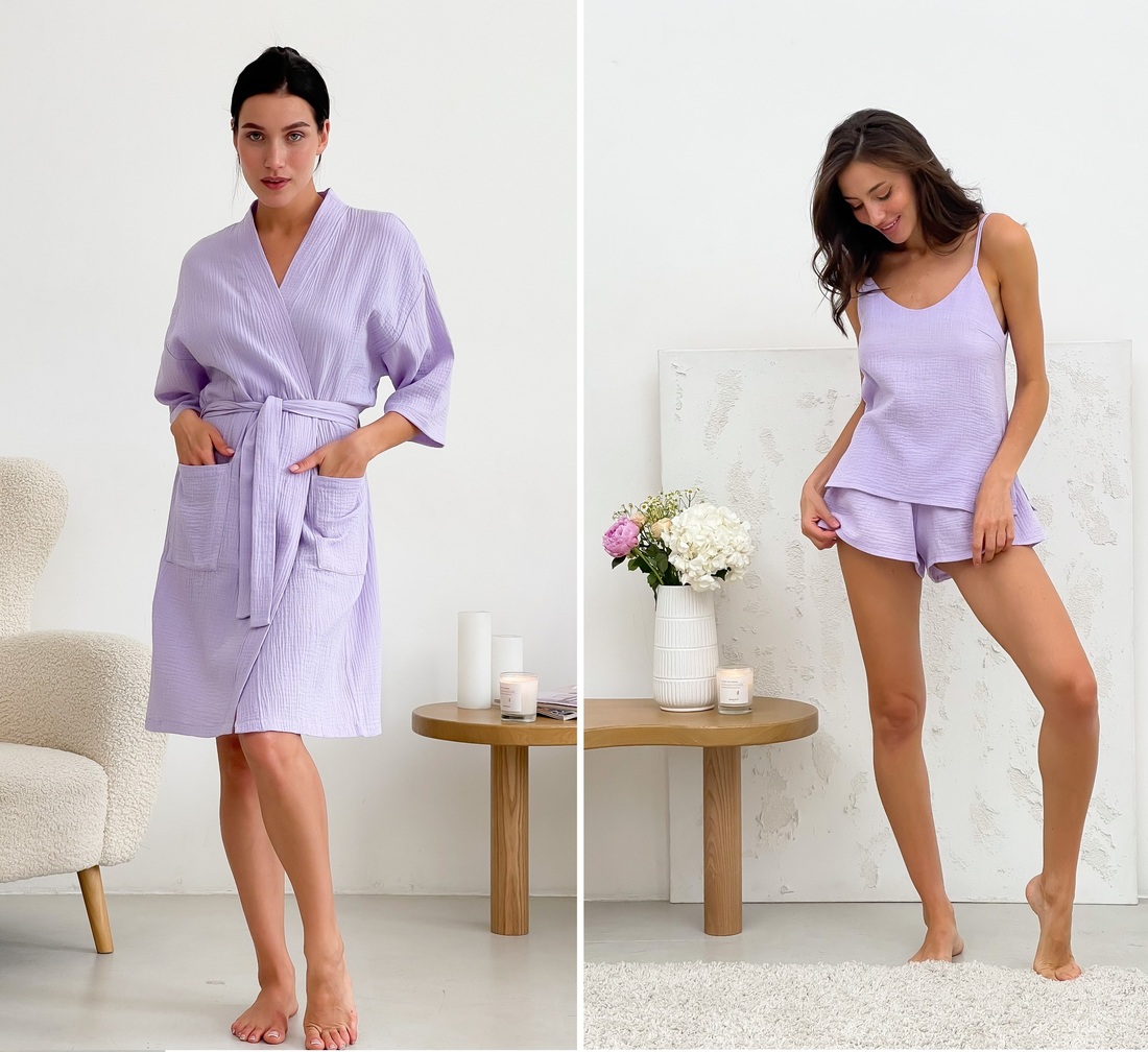 Комплект жіночий мусліновий з піжами та халату Cosy лаванда. Стильна муслінова піжама з майки та коротких шортів доповнена легким халатом. Бретельки майки регулюються. Одяг виконаний з приємної на дотик мусліну на основі 100% бавовни в лавандовому кольорі.