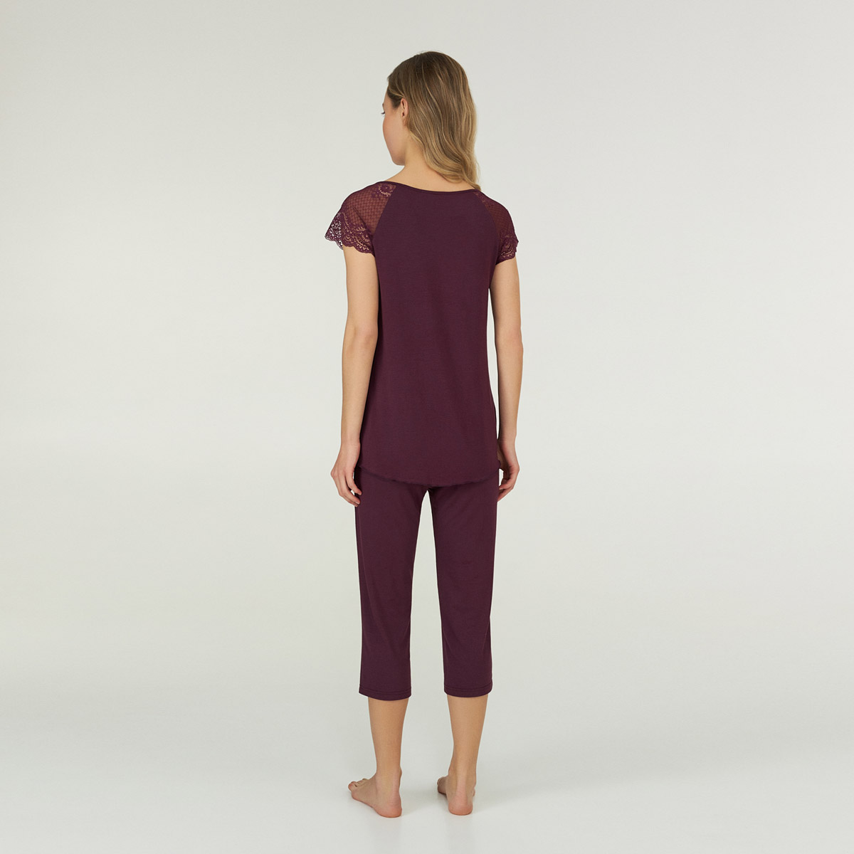 Жіноча піжама із серії Cabernet від Ellen — стильний і комфортний комплект для відпочинку. Виготовлена з м'якого модалу, піжама бордового кольору поєднує в собі елегантність та затишок. Футболка вільного крою з короткими мереживними рукавами надає романтичного вигляду, а кюлоти з гумкою забезпечують зручність і свободу рухів. Гладка та приємна на дотик тканина робить кожну ніч комфортною.