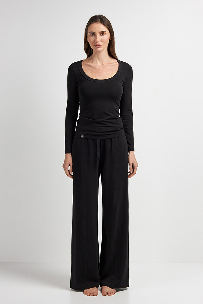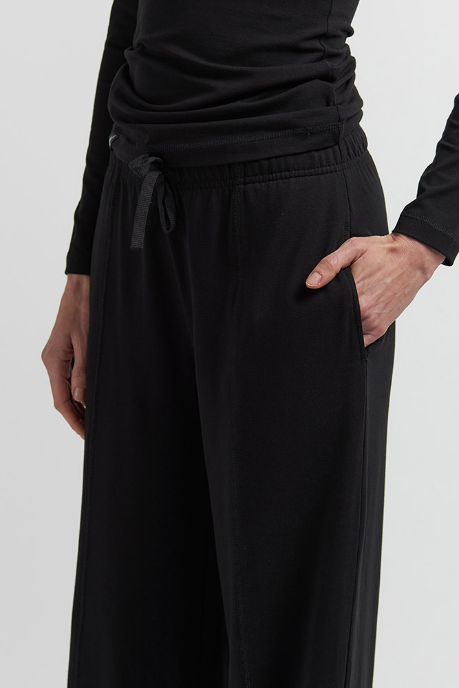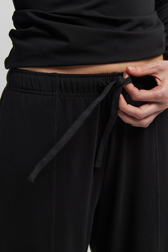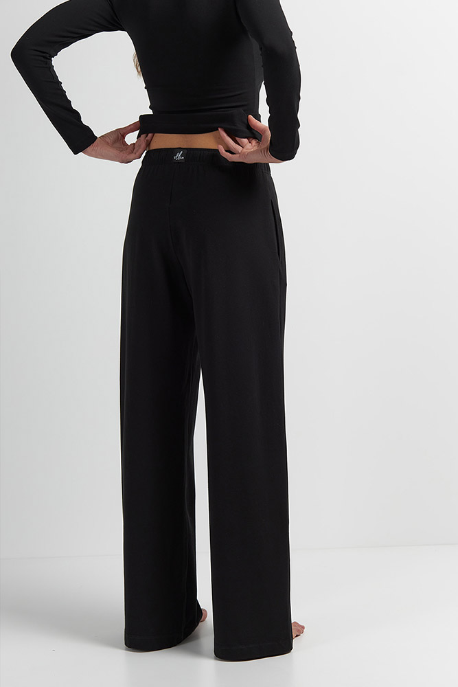 Жіночі домашні штани чорного кольору. Ідеальний вибір для комфортного відпочинку та сну. Модель чорного кольору, вільного крою, зі зручними бічними кишеньками, на поясі гумка і шнур. М'яка та приємна до тіла тканина на основі волокон бавовни та модалу відмінно пропускає повітря, забезпечує комфорт і свободу рухів.
