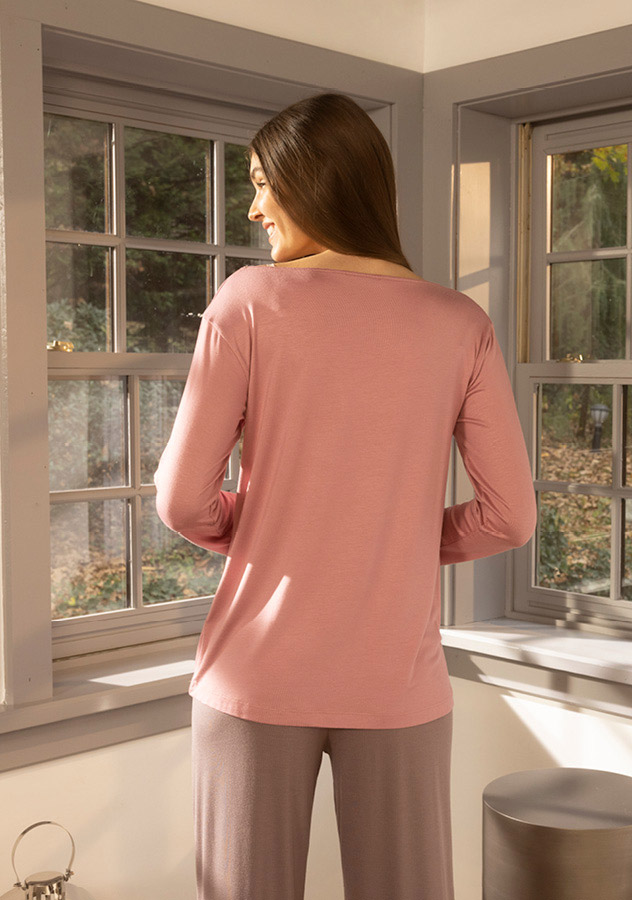 Домашній одяг преміум-класу, створений для поціновувачів комфорту та якісних тканин. Лонгслів рожевого кольору, виконаний з віскози. Тканина дуже м'яка і ніжна на дотик, еластична, відмінно пропускає повітря. Лаконічний дизайн підкреслює витончену простоту.