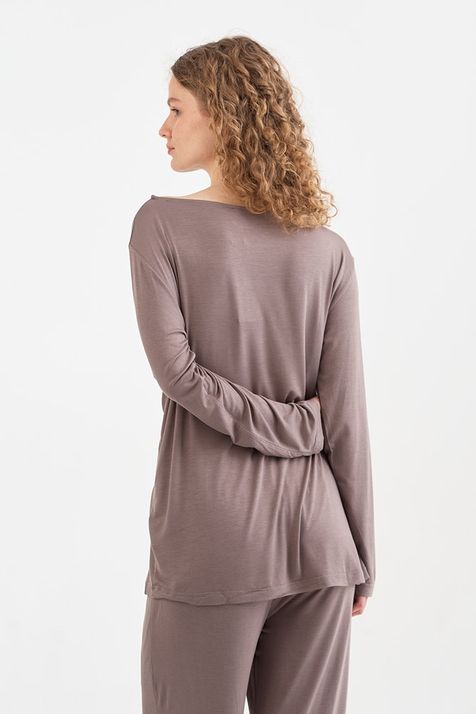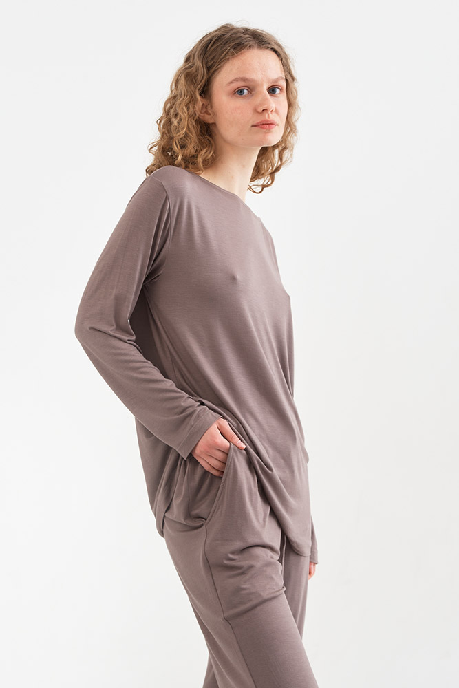 Домашній одяг преміум-класу, створений для поціновувачів комфорту та якісних тканин. Лонгслів темно-бежевого кольору, виконаний з віскози. Тканина дуже м'яка і ніжна на дотик, еластична, відмінно пропускає повітря. Лаконічний дизайн підкреслює витончену простоту.