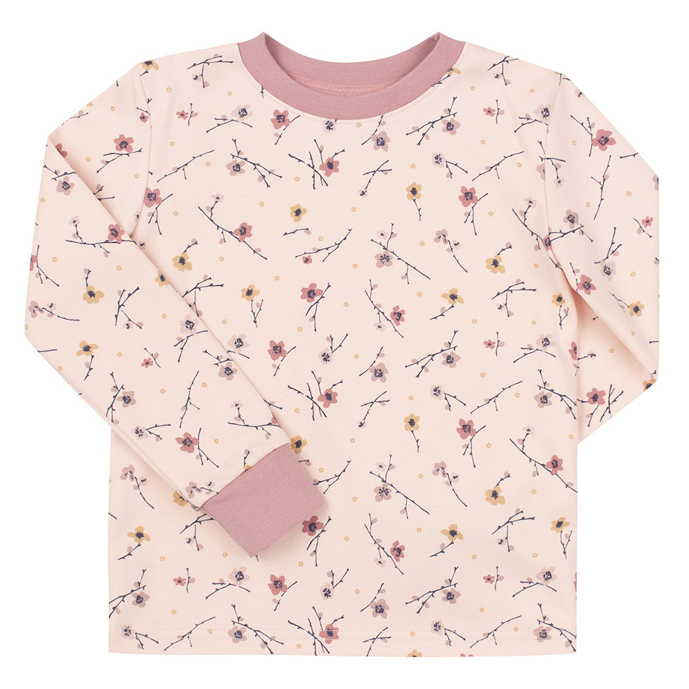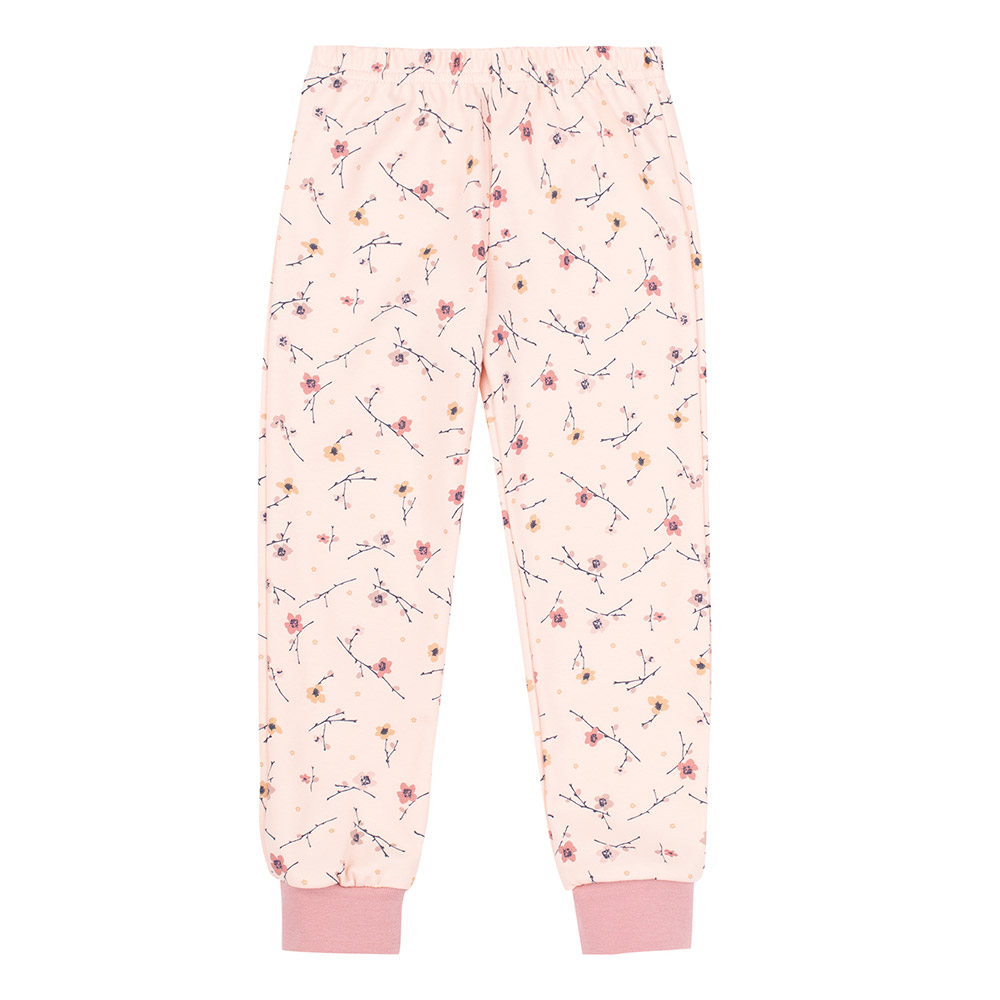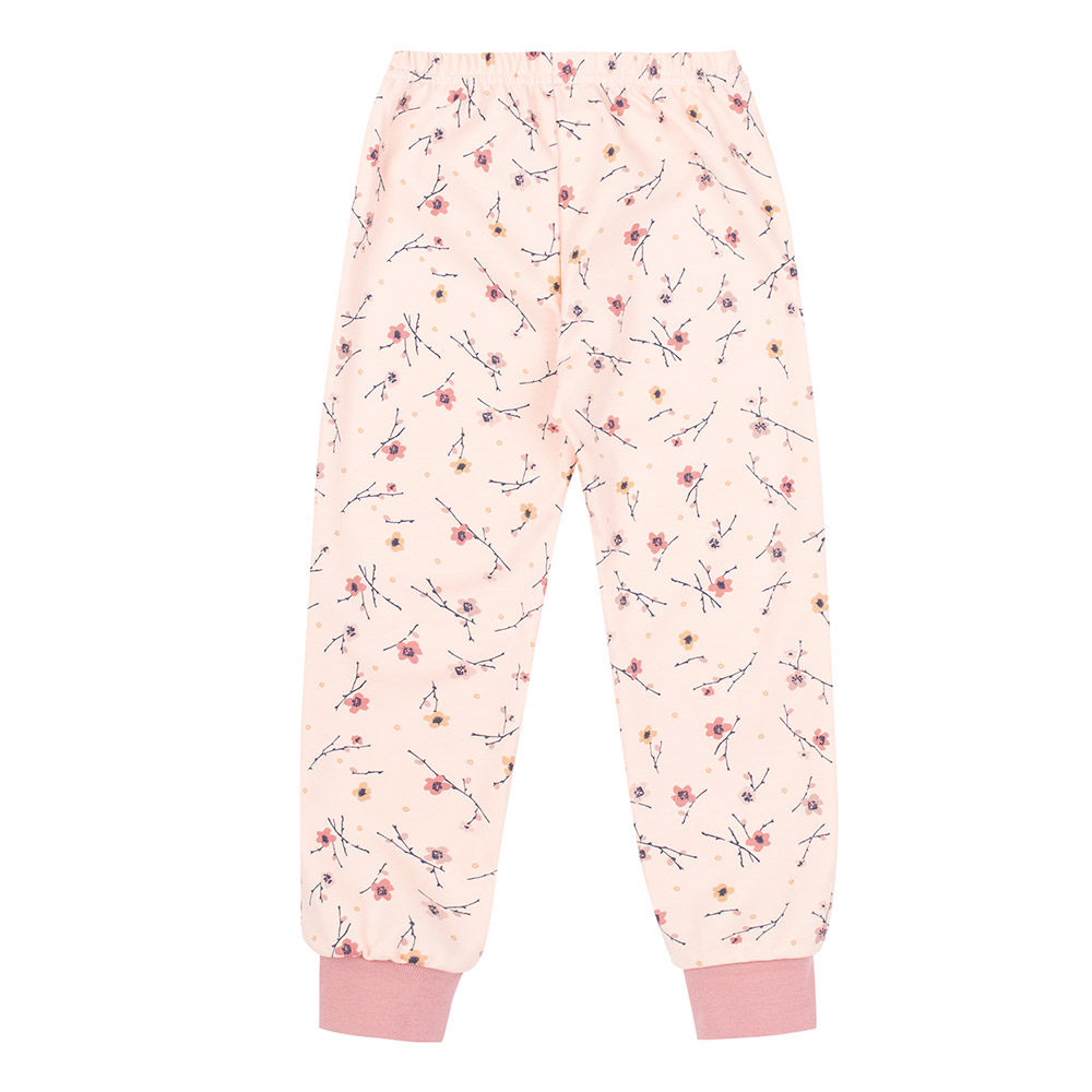 Дитяча піжама складається з кофти та штанів. Модель ніжного рожевого кольору з красивим квітковим принтом, підійде для дівчинки. Тканина з натуральної бавовни м'яка і приємна на дотик, забезпечує комфорт і затишок. Кофта з довгими рукавами. Штани зі зручною гумкою на поясі та манжетами знизу.