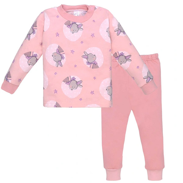 Тепла піжама - ідеальний вибір для затишних зимових ночей. Комплект складається з лонгсліва та штанів. Лонгслів світло-рожевого кольору з симпатичним принтом із зайчиками. Штани однотонні, рожевого кольору.
