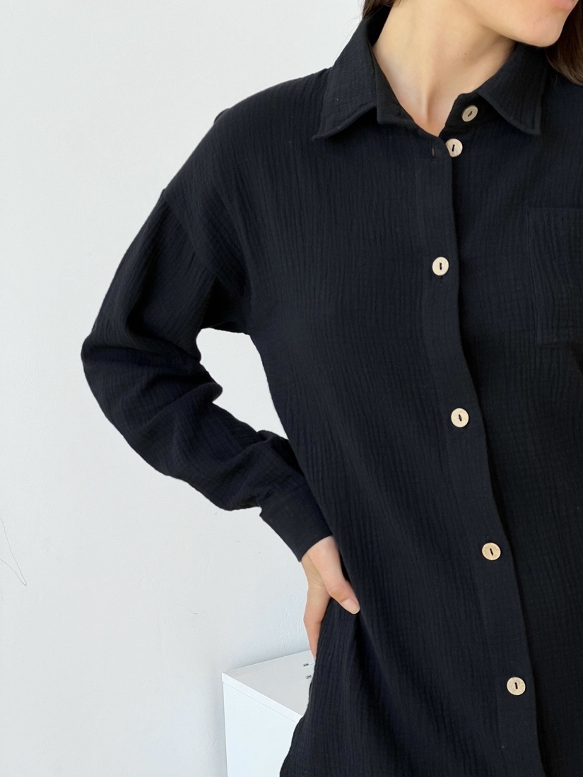 Сорочка жіноча з мусліну Coconut Cosy MD06 чорна. Повітряна, легка жіноча сорочка із натуральної тканини муслін. Це просто універсальна річ для жіночого гардеробу. Цю сорочку можна носити вдома, щоб виглядати привабливо та комфортно. Ідеально виглядає як туніка для пляжу, або стане гарним доповненням вашого образу у поєднанні із шортами чи брюками.
