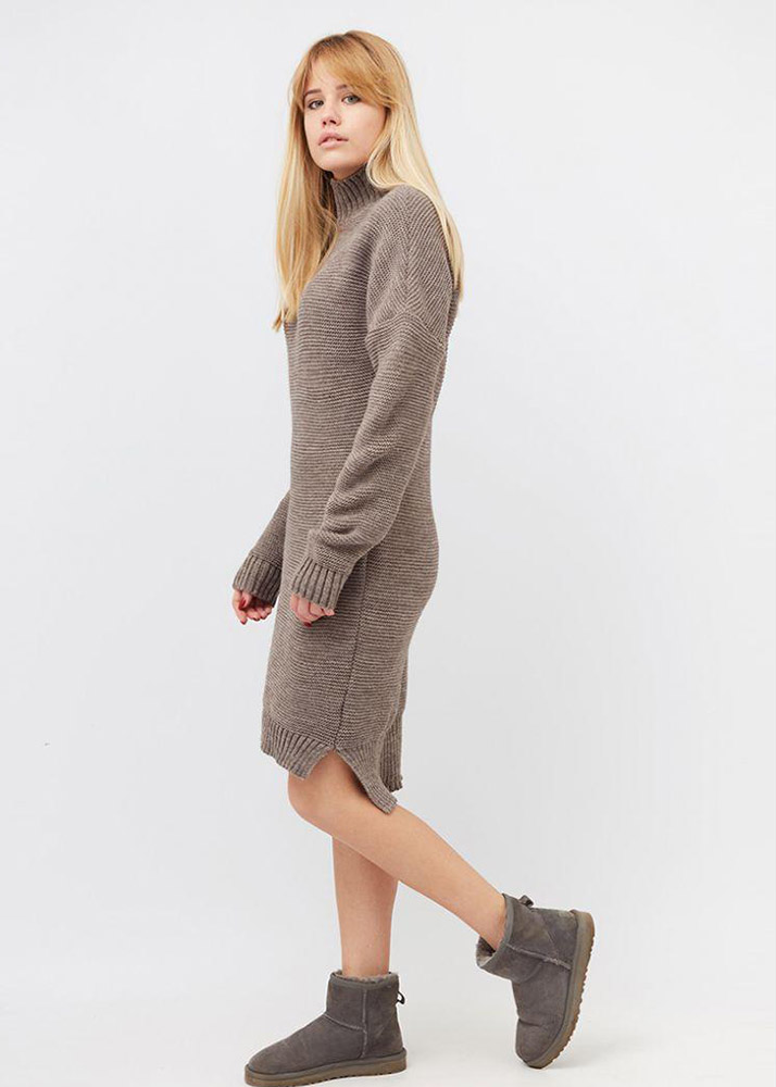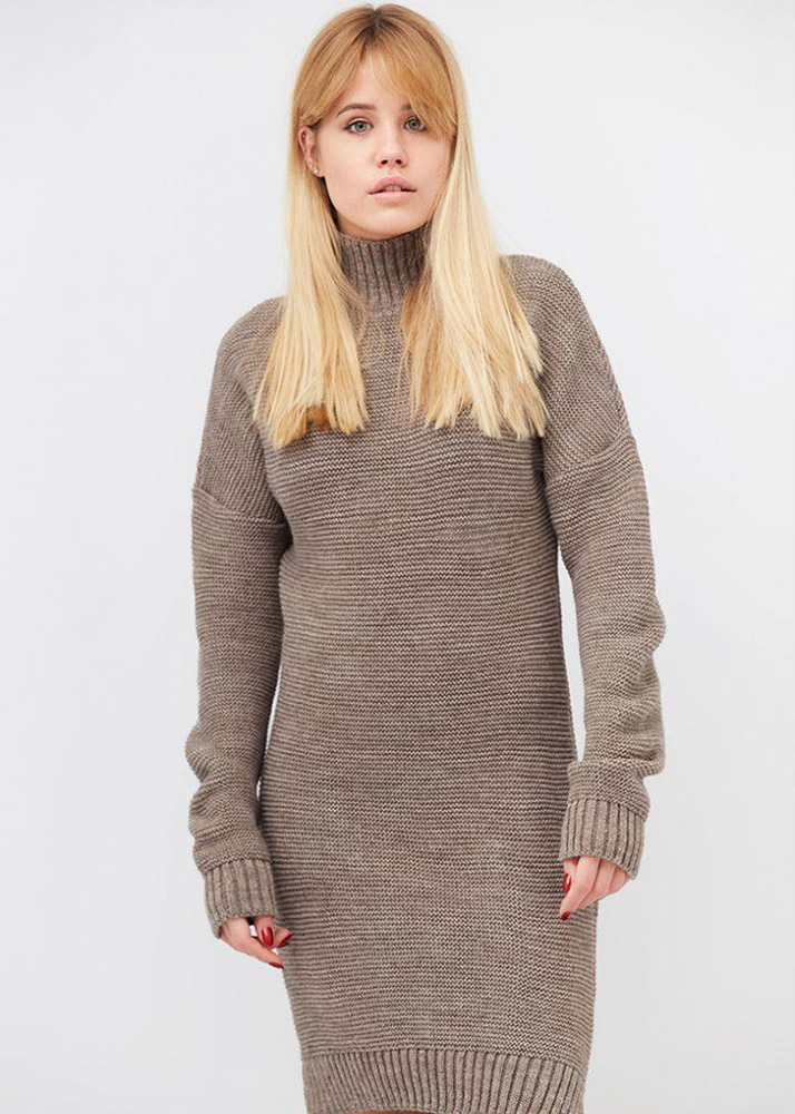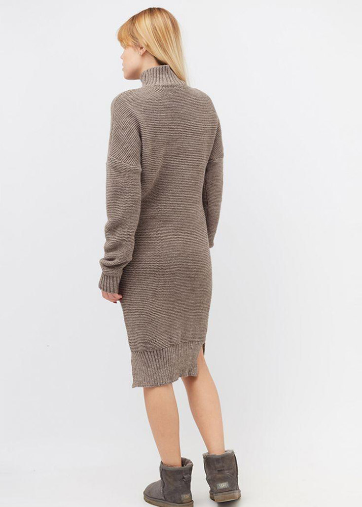 Тепла в'язана сукня сіро-коричневого відтінку. Модель середньої довжини, машинної в'язки, з високою горловиною і довгими рукавами. Сукня стане чудовою базою для створення затишних образів, чудово доповнить гардероб. Однотонний дизайн робить сукню універсальною, легко поєднується з іншим одягом та аксесуарами. Пряжа з натуральної вовни та акрилу приємна до тіла, затишна і тепла, забезпечує комфорт, водночас міцна і довговічна в експлуатації.