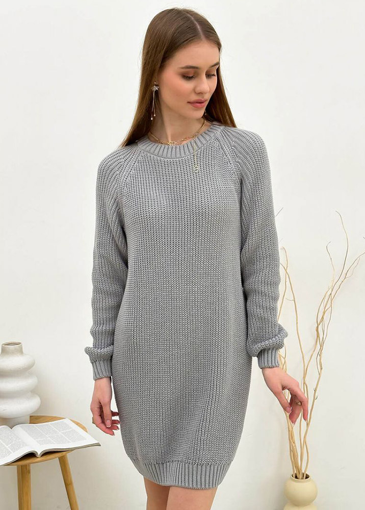 В'язана однотонна сукня сірого кольору. Сукня стане чудовою базою для створення модного та стильного образу, підійде для повсякденного носіння. Матеріал м'який, приємний до тіла, затишний та комфортний, виконаний з натуральної бавовняної пряжі високої якості.