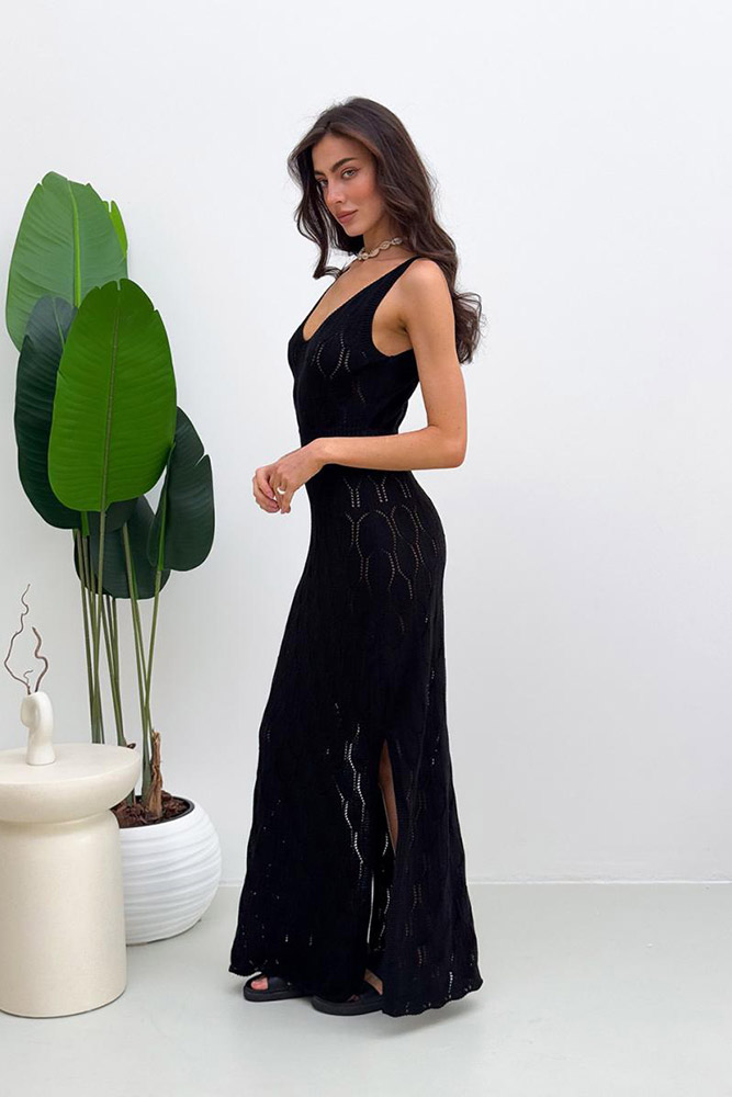 Однотонна довга в'язана сукня чорного кольору з красивим ажурним візерунком. Сукня має елегантний вигляд, чудово підійде для створення романтичних образів, стане гарним акцентом у гардеробі. Пряжа з бавовни та акрилу приємна до тіла, затишна, забезпечує комфорт, водночас практична і довговічна в експлуатації.