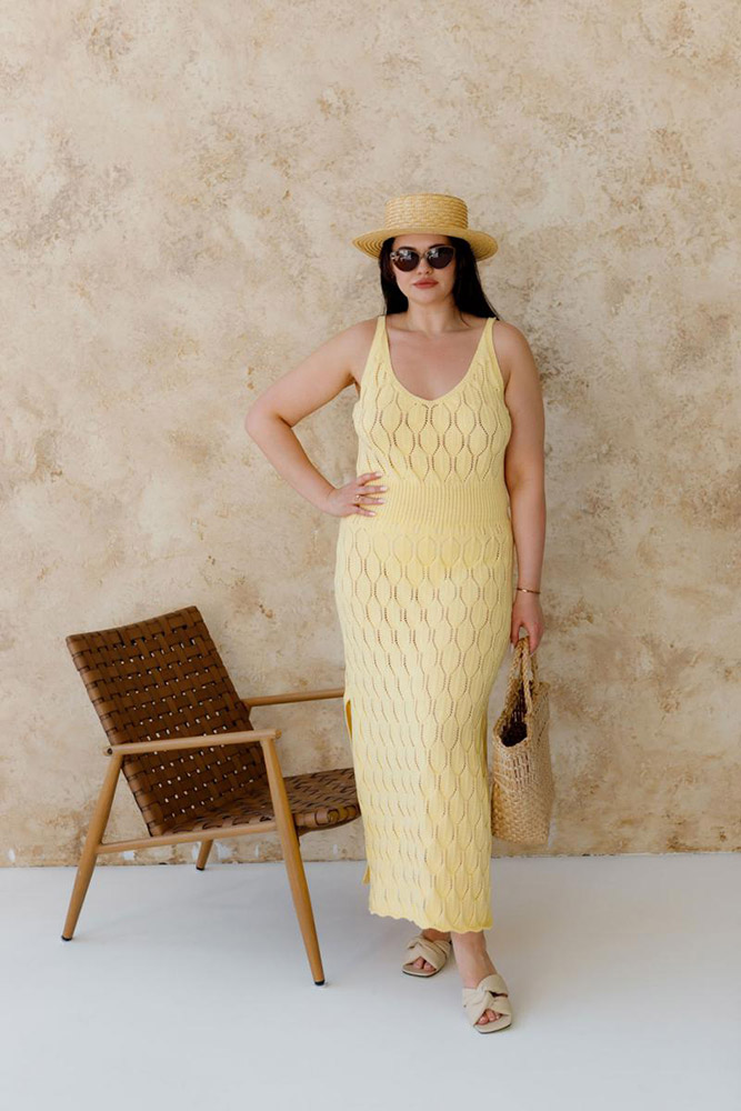 Однотонна довга в'язана сукня жовтого кольору з красивим ажурним візерунком. Сукня має елегантний вигляд, чудово підійде для створення романтичних образів, стане гарним акцентом у гардеробі. Пряжа з бавовни та акрилу приємна до тіла, затишна, забезпечує комфорт, водночас практична і довговічна в експлуатації.