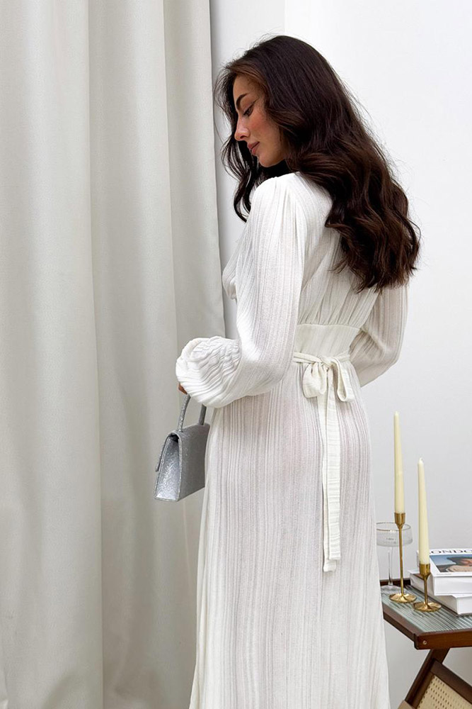 Однотонна довга в'язана сукня ніжного молочного кольору. Сукня має елегантний вигляд, чудово підійде для створення романтичних образів, стане гарним акцентом у гардеробі. Сукня з V-подібним вирізом, з довгими рукавами, фіксується пояском, збоку є потайна блискавка. Пряжа з віскози та акрилу приємна до тіла, затишна, забезпечує комфорт, водночас міцна і довговічна в експлуатації.
