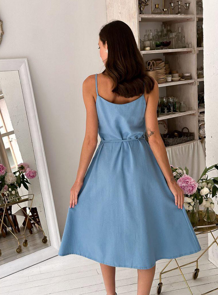 Чудова літня сукня на запах. Модель на бретелях, однотонна, блакитного кольору, виготовлена з натуральної тканини на основі бавовни та льону. Сукня поєднує комфорт та елегантність, дозволяє вам виглядати стильно у літню спеку. Натуральний матеріал легкий і приємний на дотик, чудово пропускає повітря, гіпоалергенний, не електризується. Ця сукня ідеально поєднується з аксесуарами різних відтінків і може бути доповнена капелюхом, сумкою або парою стильних сандалів. Ця сукня стане чудовим вибором для модних жінок, які прагнуть виглядати елегантно і почуватися комфортно під час літнього сезону.