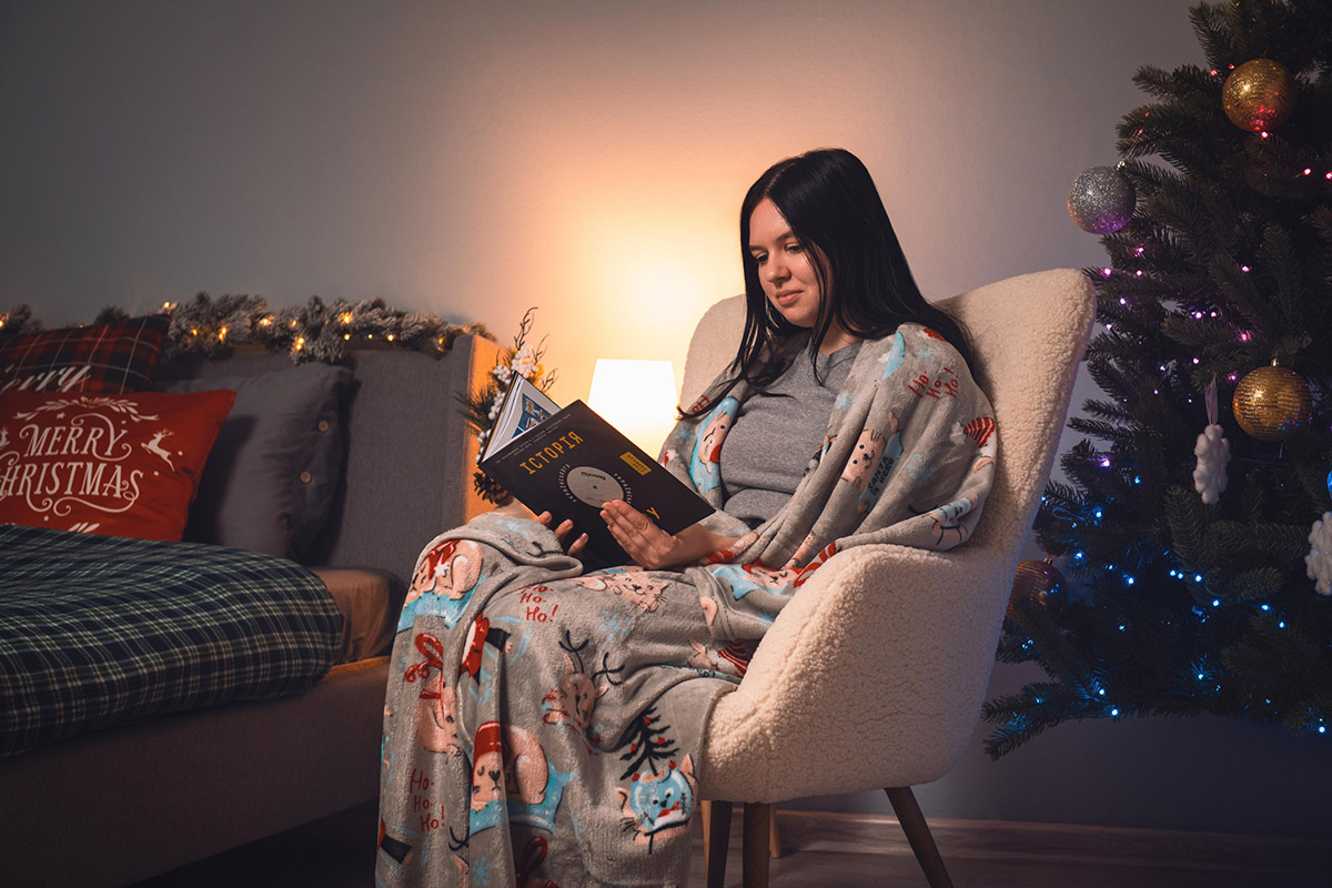 Плед сірого кольору з симпатичним святковим принтом із кумедними котиками. Плед подарує святковий настрій, наповнить інтер'єр затишком і гармонією. Фланелевий плед із м'яким ворсом є чудовим поєднанням комфорту, стилю та функціональності. Плед стане ідеальним аксесуаром для затишних вечорів вдома або для використання на відкритому повітрі. Волокна поліестеру забезпечують пледу м'якість, міцність і довговічність, а також роблять його легким у догляді.