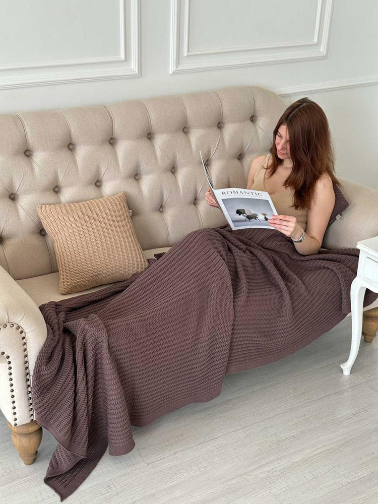 Гарний в'язаний однотонний плед шоколадного кольору з рельєфною текстурою. Плед прикрасить кімнату, зробить інтер'єр більш затишним, подарує тепло і комфорт під час відпочинку. Плед стане ідеальним аксесуаром для затишних вечорів вдома або для використання на відкритому повітрі.